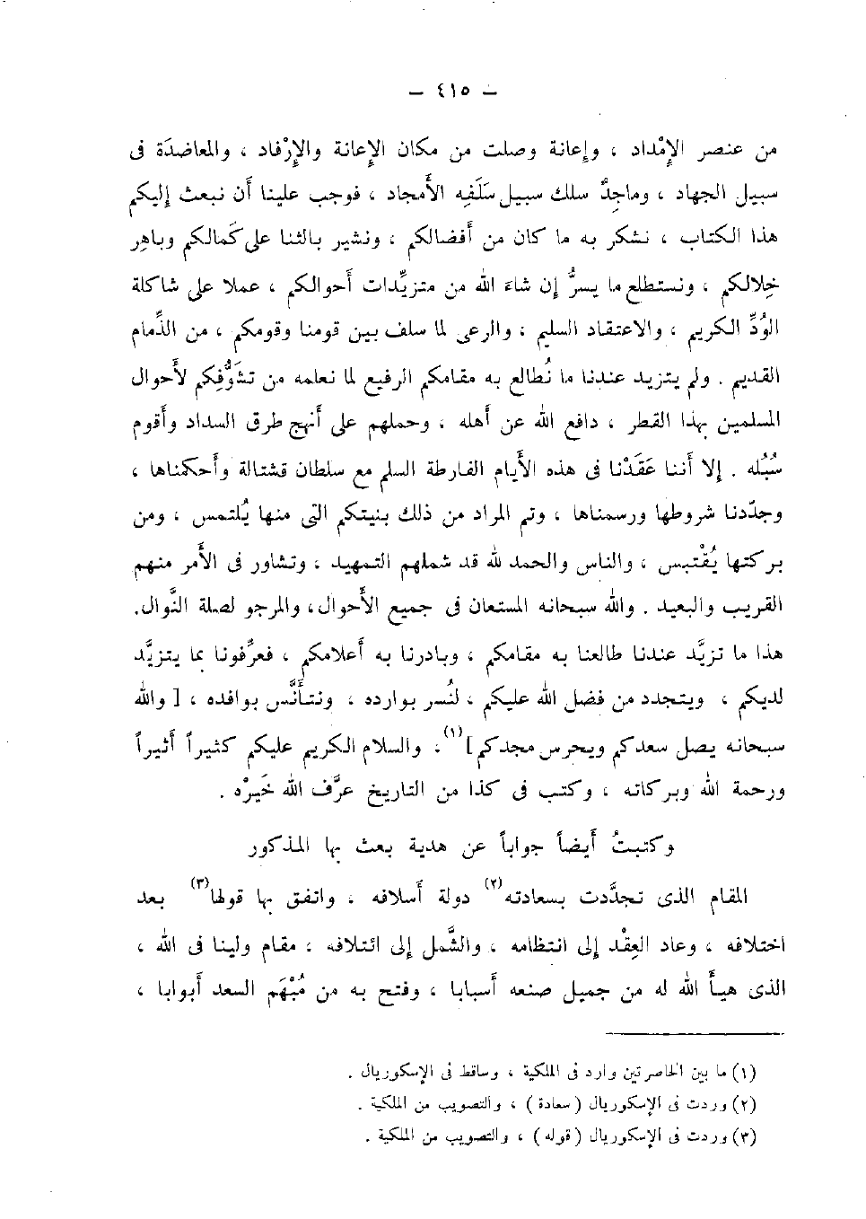 من عنصر الْإِمْدَاد، وإعانة وصلت من مَكَان الْإِعَانَة والإرفاد، والمعاضدة فِي سَبِيل الْجِهَاد، وماجد سلك سَبِيل سلفه الأمجاد، فَوَجَبَ علينا أَن نبعث إِلَيْكُم هَذَا الْكتاب، نشكر بِهِ مَا كَانَ من أفضالكم، ونشير بالثنا على كمالكم وباهر خلالكم، ونستطلع مَا يسر إِن شَاءَ الله من متزيدات أحوالكم، عملا على شاكلة الود الْكَرِيم، والاعتقاد السَّلِيم، والرعى لما سلف بَين قَومنَا وقومكم، من الذمام الْقَدِيم. وَلم يتزيد عندنَا مَا نطالع بِهِ مقامكم الرفيع لما نعلمهُ من تشوفكم لأحوال الْمُسلمين بِهَذَا الْقطر، دَافع الله عَن أَهله، وَحَملهمْ على أنهج طرق السداد وأقوم سبله. إِلَّا أننا عَقدنَا فِي هَذِه الْأَيَّام الفارطة السّلم مَعَ سُلْطَان قشتالة وأحكمناها، وجددنا شُرُوطهَا ورسمناها، وَتمّ المُرَاد من ذَلِك بنيتكم الَّتِي مِنْهَا يلْتَمس، وَمن بركتها يقتبس، وَالنَّاس وَالْحَمْد لله قد شملهم التَّمْهِيد، وتشاور فِي الْأَمر مِنْهُم الْقَرِيب والبعيد. وَالله سُبْحَانَهُ الْمُسْتَعَان فِي جَمِيع الْأَحْوَال، والمرجو لصلة النوال. هَذَا مَا تزيد عندنَا طالعنا بِهِ مقامكم، وبادرنا بِهِ أعلامكم، فعرفونا بِمَا يتزيد ليدكم، ويتجدد من فضل الله عَلَيْكُم، لنسر بوارده، ونتأنس بوافده، [وَالله سُبْحَانَهُ يصل سعدكم ويحرس مجدكم] ، وَالسَّلَام الْكَرِيم عَلَيْكُم كثيرا أثيرا وَرَحْمَة الله وَبَرَكَاته، وَكتب فِي كَذَا من التَّارِيخ عرف الله خَيره.