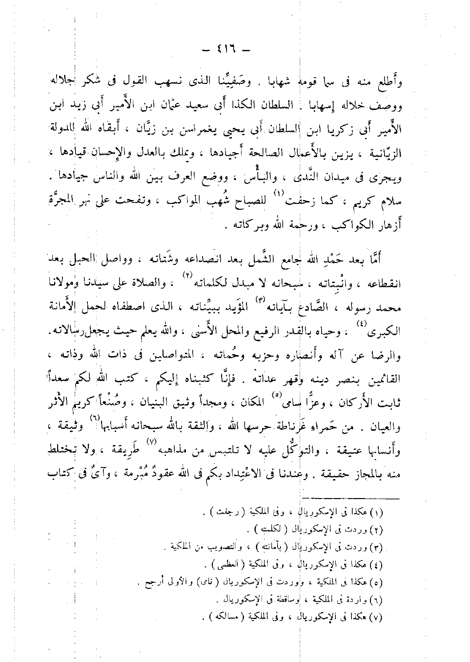 وأطلع مِنْهُ فِي سما قومه شهابا. وصفينا الَّذِي نسهب القَوْل فِي شكر جَلَاله وَوصف خلاله إسهابا. السُّلْطَان الكذا أبي سعيد عُثْمَان ابْن الْأَمِير أبي زيد ابْن الْأَمِير أبي زَكَرِيَّا ابْن السُّلْطَان أبي يحى يغمراسن بن زيان، أبقاه الله للدولة الزيانية، يزن بِالْأَعْمَالِ الصَّالِحَة أجيادها، وَيملك بِالْعَدْلِ وَالْإِحْسَان قيادها، وَيجْرِي فِي ميدان الندى، والبأس، وَوضع الْعرف بَين الله وَالنَّاس جيادها. سَلام كريم، كَمَا زحفت للصباح شهب المواكب، وتفحت على نهر المجرة أزهار الْكَوَاكِب، وَرَحْمَة الله وَبَرَكَاته.