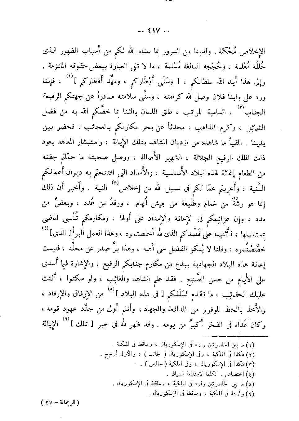الْإِخْلَاص محكمَة. ولدينا من السرُور بِمَا سناه الله لكم من أَسبَاب الظُّهُور الَّذِي حلله معلمة، وحججه الْبَالِغَة مسلمة، مَا لَا تفي الْعبارَة بِبَعْض حُقُوقه الملتزمة. وَإِلَى هَذَا أيد الله سلطانكم، [وسنى أوطاركم، ومهد أقطاركم] ، فإننا ورد على بابنا فلَان وصل الله كرامته، وسنى سَلَامَته صادرا عَن جهتكم الرفيعة الْجَانِب، السامية الْمَرَاتِب، طلق اللِّسَان بالثنا بِمَا خصكم الله بِهِ من فضل الشَّمَائِل، وكرم الْمذَاهب، مُحدثا عَن بَحر مكارمكم بالعجائب، فَحَضَرَ بَين يدينا. ملقيا مَا شَاهده من ازديان الْمشَاهد بِتِلْكَ الإيالة، واستبشار الْمعَاهد بِعُود ذَلِك الْملك الرفيع الْجَلالَة، الشهير الْأَصَالَة، وَوصل صحبته مَا حملتم جفْنه من الطَّعَام إغاثة لهَذِهِ الْبِلَاد الأندلسية، والأمداد الَّتِي افتتحتم بِهِ ديوَان أَعمالكُم السّنيَّة، وأعربتم عَمَّا لكم فِي سَبِيل الله من إخلاص النِّيَّة. وَأخْبر أَن ذَلِك إِنَّمَا هُوَ رشة من غمام وطليعة من جَيش لهام، ورفد من عدد، وَبَعض من مدد، وَإِن عزائمكم فِي الْإِعَانَة والإمداد على أَولهَا، ومكارمكم تنسى الْمَاضِي بمستقبلها، فأثنينا على قصدكم الَّذِي لله أخلصتموه، وَهَذَا الْعَمَل الْبر [الَّذِي] خصصتموه، وَقُلْنَا لَا يُنكر الْفضل على أَهله، وَهَذَا بر صدر عَن مَحَله، فَلَيْسَتْ إِعَانَة هَذِه الْبِلَاد الجهادية ببدع من مَكَارِم جنابكم الرفيع، وَالْإِشَارَة فِيمَا أسدى على الْأَيَّام من حسن الصَّنِيع. فقد علم الشَّاهِد وَالْغَائِب، وَلَو سكتوا، أثنت عَلَيْك الحقائب، مَا تقدم لسلفكم [فِي هَذِه الْبِلَاد] من الإرفاق والإرفاد، وَالْأَخْذ بالحظ الموفور من المدافعة وَالْجهَاد، وَأَنْتُم أولى من جدد عهود قومه، وَكَانَ غداه فِي الْفَخر أكبر من يَوْمه. وَقد ظهر لله فِي جبر [تِلْكَ] الإيالة