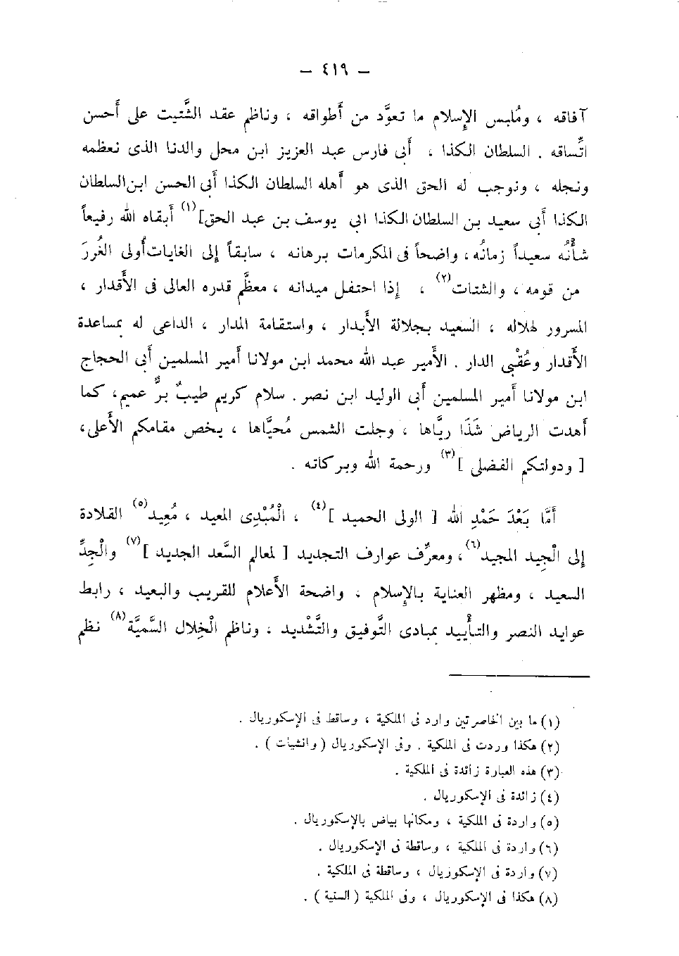 أما بعد حمد الله [الْوَلِيّ الحميد] ، المبدى المعيد، معيد القلادة إِلَى الْجيد الْمجِيد، ومعرف عوارف التَّجْدِيد [لمعالم السعد الْجَدِيد] وَالْجد السعيد، ومظهر الْعِنَايَة بِالْإِسْلَامِ، وَاضِحَة الْأَعْلَام للقريب والبعيد، رابط عوايد النَّصْر والتأييد بمبادي التَّوْفِيق وَالتَّشْدِيد، وناظم الْخلال السمية نظم
