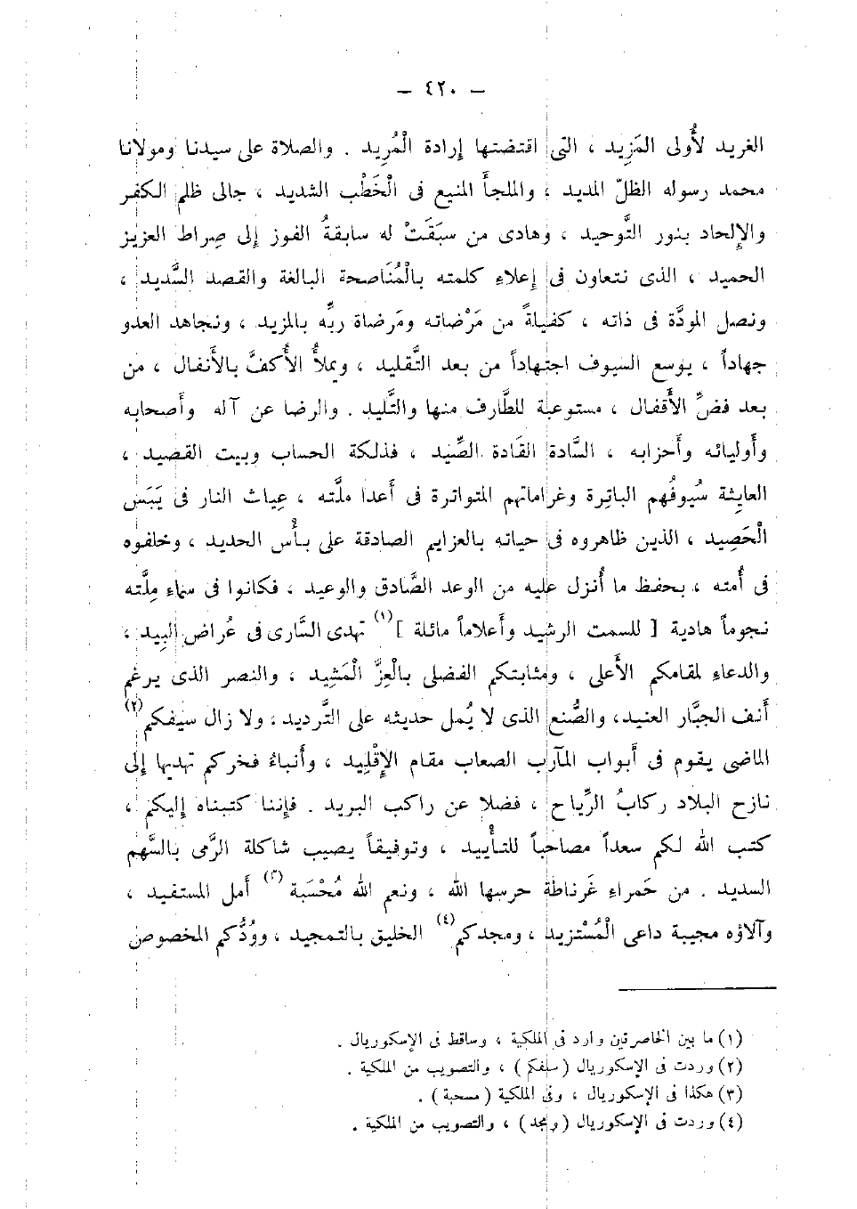 الغريد لأولى الْمَزِيد، الَّتِي اقتضتها إِرَادَة المريد. وَالصَّلَاة على سيدنَا ومولانا مُحَمَّد رَسُوله الظل المديد، والملجأ المنيع فِي الْخطب الشَّديد، جالى ظلم الْكفْر والإلحاد بِنور التَّوْحِيد، وهادي من سبقت لَهُ سَابِقَة الْفَوْز إِلَى صِرَاط الْعَزِيز الحميد، الَّذِي نتعاون فِي إعلاء كَلمته بالمناصحة الْبَالِغَة وَالْقَصْد السديد، ونصل الْمَوَدَّة فِي ذَاته، كفيلة من مرضاته ومرضاة ربه بالمزيد، ونجاهد الْعَدو جهادا، يُوسع السيوف اجْتِهَادًا من بعد التَّقْلِيد، ويملأ الأكف بالأنفال، من بعد فض الأقفال، مستوعبة للطارف مِنْهَا والتليد. وَالرِّضَا عَن آله وَأَصْحَابه وأوليائه وأحزابه، السَّادة القادة الصَّيْد، فذلكة الْحساب وَبَيت القصيد، العايثة سيوفهم الباترة وغراماتهم المتواترة فِي أعدا مِلَّته، عياث النَّار فِي يبس الحصيد، الَّذين ظاهروه فِي حَيَاته بالعزايم الصادقة على بَأْس الْحَدِيد، وخلفوه فِي أمته، بِحِفْظ مَا أنزل عَلَيْهِ من الْوَعْد الصَّادِق والوعيد، فَكَانُوا فِي سَمَاء مِلَّته نجوما هادية [للسمت الرشيد وأعلاما مائلة] تهدي الساري فِي عراض البيد، وَالدُّعَاء لمقامكم الْأَعْلَى، ومثابتكم الفضلى بالعز المشيد، والنصر الَّذِي يرغم أنف الْجَبَّار العنيد، والصنع الَّذِي لَا يمل حَدِيثه على الترديد، وَلَا زَالَ سيفكم الْمَاضِي يقوم فِي أَبْوَاب المآرب الصعاب مقَام الإقليد، وأنباء فخركم تهديها إِلَى نازح الْبِلَاد ركاب الرِّيَاح، فضلا عَن رَاكب الْبَرِيد. فإننا كتبناه إِلَيْكُم، كتب الله لكم سَعْدا مصاحبا للتأييد، وتوفيقا يُصِيب شاكلة الرمى بِالسَّهْمِ السديد. من حَمْرَاء غرناطة حرسها الله، وَنعم الله محسبة أمل المستفيد، وآلاؤه مجيبة دَاعِي المستزيد، ومجدكم الخليق بالتمجيد، وودكم الْمَخْصُوص