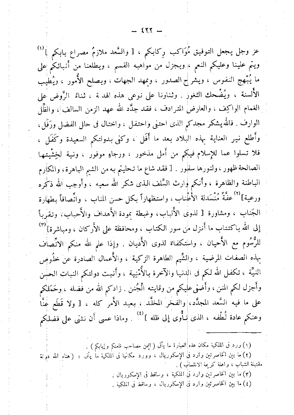 عز وَجل يَجْعَل التَّوْفِيق مواكب ركابكم، [والسعد ملازم مصراع بَابَكُمْ] وَيتم علينا وَعَلَيْكُم النعم، ويجزل من مواهبه الْقسم، ويطلعنا من أنبائكم على مَا يبهج النُّفُوس، ويشرح الصُّدُور، ويمهد الْجِهَات، وَيصْلح الْأُمُور، ويطيب الْأَلْسِنَة، ويضحك الثغور. وثناونا على نوعى هَذِه الْهَدِيَّة، ثَنَاء الرَّوْض على الْغَمَام الواكف، والعارض المترادف، فقد جدد الله عهد الزَّمن السالف، والظل الوارف. فَالله يشْكر مجدكم الَّذِي احتفى واحتفل، واختال فِي حلل الْفضل ورفل، وأطلع نير الْعِنَايَة بِهَذِهِ الْبِلَاد بعد مَا أفل، وَكفى بدولتكم السعيدة وكفل، فَلَا تسلوا عَمَّا لِلْإِسْلَامِ فِيكُم من أمل مذخور، ورجاء موفور، وَنِيَّة لخشيتها الصَّالِحَة ظُهُور، ولنورها سفور. [فقد شاع مَا تحليتم بِهِ من الشيم الباهرة، والمكارم الْبَاطِنَة وَالظَّاهِرَة، وأنكم وَارِث السّلف الَّذِي شكر الله سَعْيه، وَأوجب الله ذكره ورعية] عفة منسدلة الْأَطْنَاب، واستظهارا بِكُل حسن المناب، واتصافا بِطَهَارَة الجناب، ومشاورة [لِذَوي الْأَلْبَاب، وغبطة بمودة الأهداف والأحباب، وتقربا إِلَى الله باكتتاب مَا أنزل من سور الْكتاب، ومحافظة على الْأَركان، ومباشرة] للرسوم مَعَ الأحيان، واستكفاء لِذَوي الْأَدْيَان. وَإِذا علم الله مِنْكُم الاتصاف بِهَذِهِ الصِّفَات المرضية، والشيم الطاهرة الزكية، والأعمال الصادرة عَن خلوص النِّيَّة، تكفل الله لكم فِي الدُّنْيَا وَالْآخِرَة بالأمنية، وَأنْبت دولتكم النَّبَات الْحسن وأجزل لكم المنن، وأضفى عَلَيْكُم من وقايته الجنن. زادكم الله من فَضله، وحملكم على مَا فِيهِ السعد المجدد، وَالْفَخْر المخلد، بعيد الْأَمر كُله، [وَلَا قطع عَنَّا وعنكم عَادَة لطفه، الَّذِي نأوى إِلَى ظله] . وماذا عَسى أَن نثني على فَضلكُمْ