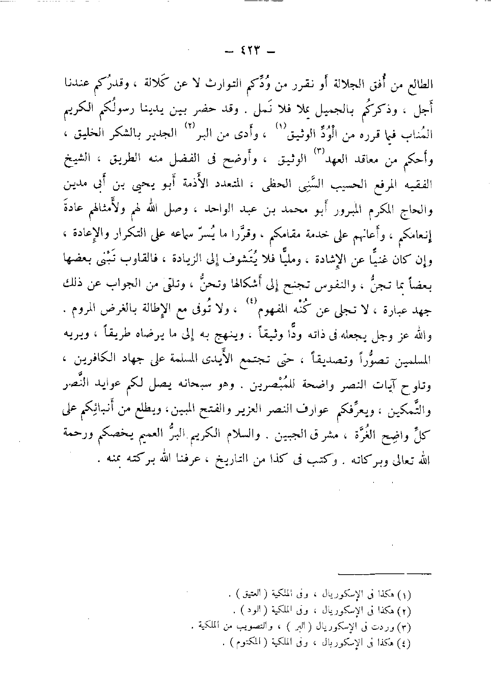 الطالع من أفق الْجَلالَة أَو نقرر من ودكم التَّوَارُث لَا عَن كَلَالَة، وقدركم عندنَا أجل، وذكركم بالجميل يملا فَلَا نمل. وَقد حضر بَين يدينا رَسُولكُم الْكَرِيم المناب فِيمَا قَرَّرَهُ من الود الوثيق، وَأدّى من الْبر الجدير بالشكر الخليق، وَأحكم من معاقد الْعَهْد الوثيق، وأوضح فِي الْفضل مِنْهُ الطَّرِيق، الشَّيْخ الْفَقِيه المرفع الحسيب السنى الحظى، المتعدد الأذمة أَبُو يحيى بن أبي مَدين والحاج المكرم المبرور أَبُو مُحَمَّد بن عبد الْوَاحِد، وصل الله لَهُم ولأمثالهم عَادَة إنعامكم، وَأَعَانَهُمْ على خدمَة مقامكم، وقررا مَا يسر سَمَاعه على التّكْرَار والإعادة، وَإِن كَانَ غَنِيا عَن الإشادة، ومليا فَلَا يتشوف إِلَى الزِّيَادَة، فالقلوب تبنى بَعْضهَا بَعْضًا بِمَا تجن، والنفوس تجنح إِلَى أشكالها وتحن، وتلقى من الْجَواب عَن ذَلِك جهد عبارَة، لَا تجلى عَن كنه الْمَفْهُوم، وَلَا توفّي مَعَ الإطالة بالغرض المروم. وَالله عز وَجل يَجعله فِي ذَاته ودا وثيقا، وينهج بِهِ إِلَى مَا يرضاه طَرِيقا، ويريه الْمُسلمين تصورا وَتَصْدِيقًا، حَتَّى تَجْتَمِع الْأَيْدِي الْمسلمَة على جِهَاد الْكَافرين، وتلوح آيَات النَّصْر وَاضِحَة للمبصرين. وَهُوَ سُبْحَانَهُ يصل لكم عوايد النَّصْر والتمكين، ويعرفكم عوارف النَّصْر الْعَزِيز وَالْفَتْح الْمُبين، ويطلع من أنبائكم على كل وَاضح الْغرَّة، مشرق الجبين. وَالسَّلَام الْكَرِيم الْبر العميم يخصكم وَرَحْمَة الله تَعَالَى وَبَرَكَاته. وَكتب فِي كَذَا من التَّارِيخ، عرفنَا الله بركته بمنه.
