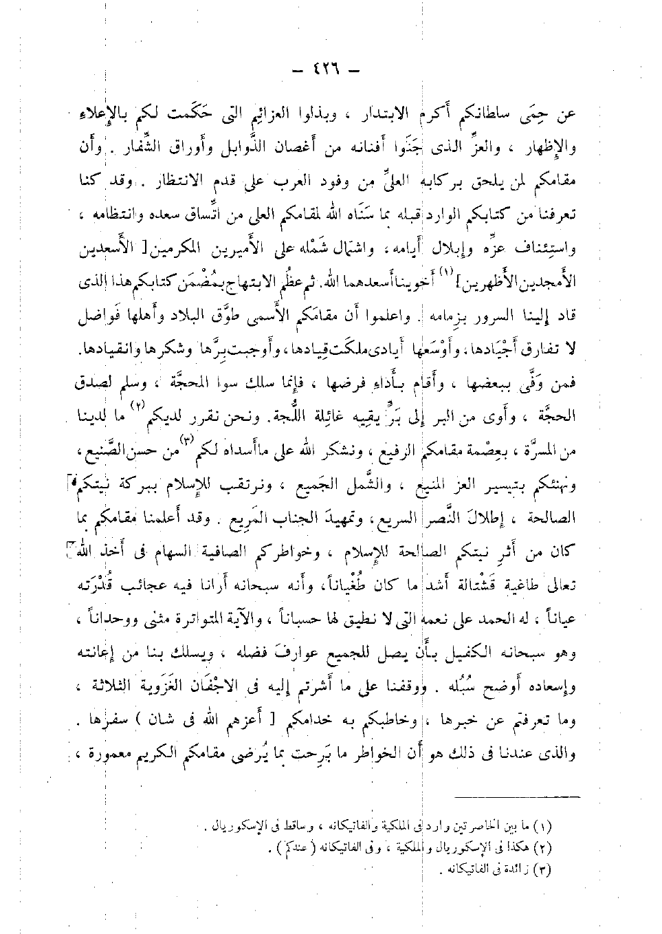 عَن حمى سلطانكم أكْرم الابتدار، وبذلوا العزائم الَّتِي حكمت لكم بالإعلاء والإظهار، والعز الَّذِي جنوا أفنانه من أَغْصَان الذوابل وأوراق الشفار. وَأَن مقامكم لمن يلْحق بركابه العلى من وُفُود الْعَرَب على قدم الِانْتِظَار. وَقد كُنَّا تعرفنا من كتابكُمْ الْوَارِد قبله بِمَا سناه الله لمقامكم الْعلي من اتساق سعده وانتظامه، واستئناف عزه وإبلال أَيَّامه، واشتمال شَمله على الأميرين الْمُكرمين [الأسعدين الأمجدين الأظهرين] أخوينا أسعدهما الله. ثمَّ عظم الابتهاج بمضمن كتابكُمْ هَذَا الَّذِي قاد إِلَيْنَا السرُور بزمامه. وَاعْلَمُوا أَن مقامكم الأسمى طوق الْبِلَاد وَأَهْلهَا فواضل لَا تفارق أجيادها، وأوسعها أيادي ملكت قيادها، وأوجبت برهَا وشكرها وانقيادها. فَمن وفى بِبَعْضِهَا، وَأقَام بأَدَاء فَرضهَا، فَإِنَّمَا سلك سوا المحجة، وَسلم لصدق الْحجَّة، وَأَوَى من الْبر إِلَى بر يَقِيه غائلة اللجة. وَنحن نقرر لديكم مَا لدينا من المسرة، بعصمة مقامكم الرفيع، ونشكر الله على مَا أسداه لكم من حسن الصَّنِيع، ونهنئكم بتيسير الْعِزّ المنيع، والشمل الْجَمِيع، ونرتقب لِلْإِسْلَامِ ببركة نيتكم الصَّالِحَة، إطلال النَّصْر السَّرِيع، وتمهيد الجناب المريع. وَقد أعلمنَا مقامكم بِمَا كَانَ من أثر نيتكم الصَّالِحَة لِلْإِسْلَامِ، وخواطركم الصافية السِّهَام فِي أَخذ الله تَعَالَى طاغية قشتالة أَشد مَا كَانَ طغيانا، وَأَنه سُبْحَانَهُ أرانا فِيهِ عجائب قدرته عيَانًا، لَهُ الْحَمد على نعمه الَّتِي لَا نطيق لَهَا حسبانا، وَالْآيَة المتواترة مثنى ووحدانا، وَهُوَ سُبْحَانَهُ الْكَفِيل بِأَن يصل للْجَمِيع عوارف فَضله، ويسلك بِنَا من إعانته وإسعاده أوضح سبله. ووقفنا على مَا أشرتم إِلَيْهِ فِي الأجفان الغزوية الثَّلَاثَة، وَمَا تعرفتم عَن خَبَرهَا، وخاطبكم بِهِ خدامكم [أعزهم الله فِي شان] سفرها. وَالَّذِي عندنَا فِي ذَلِك هُوَ أَن الخواطر مَا بَرحت بِمَا يرضى مقامكم الْكَرِيم معمورة،