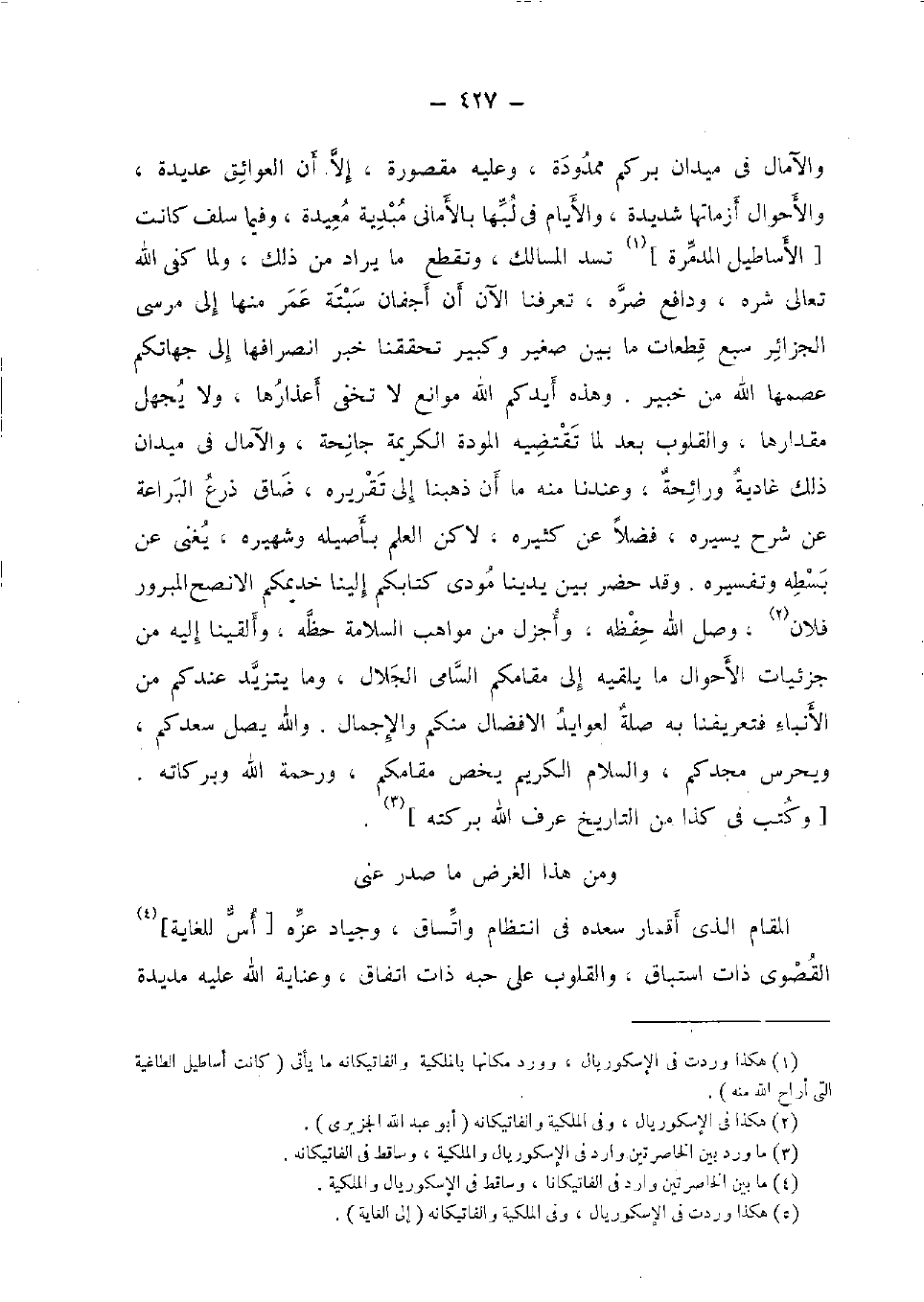 والآمال فِي ميدان بركم ممدودة، وَعَلِيهِ مَقْصُورَة، إِلَّا أَن الْعَوَائِق عديدة، وَالْأَحْوَال أزماتها شَدِيدَة، وَالْأَيَّام فِي لبها بالأماني مبدية معيدة، وَفِيمَا سلف كَانَت [الأساطيل المدمرة] تسد المسالك، وتقطع مَا يُرَاد من ذَلِك، وَلما كفى الله تَعَالَى شَره، ودافع ضره، تعرفنا الْآن أَن أجفان سبتة عمر مِنْهَا إِلَى مرسى الجزائر سبع قطعات مَا بَين صَغِير وكبير تحققنا خبر انصرافها إِلَى جهاتكم عصمها الله من خَبِير. وَهَذِه أيدكم الله مَوَانِع لَا تخفى أعذارها، وَلَا يجهل مقدارها، والقلوب بعد لما تَقْتَضِيه الْمَوَدَّة الْكَرِيمَة جانحة، والآمال فِي ميدان ذَلِك غادية ورائحة، وَعِنْدنَا مِنْهُ مَا أَن ذَهَبْنَا إِلَى تَقْرِيره، ضَاقَ ذرع البراعة عَن شرح يسيره، فضلا عَن كَثِيره، لَا كن الْعلم بأصيله وشهيره، يُغني عَن بَسطه وَتَفْسِيره. وَقد حضر بَين يدينا مودى كتابكُمْ إِلَيْنَا خديمكم الأنصح المبرور فلَان، وصل الله حفظه، وأجزل من مواهب السَّلامَة حَظه، وألقينا إِلَيْهِ من جزئيات الْأَحْوَال مَا يلقيه إِلَى مقامكم السَّامِي الْجلَال، وَمَا يتزيد عنْدكُمْ من الأنباء فتعريفنا بِهِ صلَة لعوايد الأفضال مِنْكُم والإجمال. وَالله يصل سعدكم، ويحرس مجدكم، وَالسَّلَام الْكَرِيم يخص مقامكم، وَرَحْمَة الله وَبَرَكَاته. [وَكتب فِي كَذَا من التَّارِيخ عرف الله بركته] .
