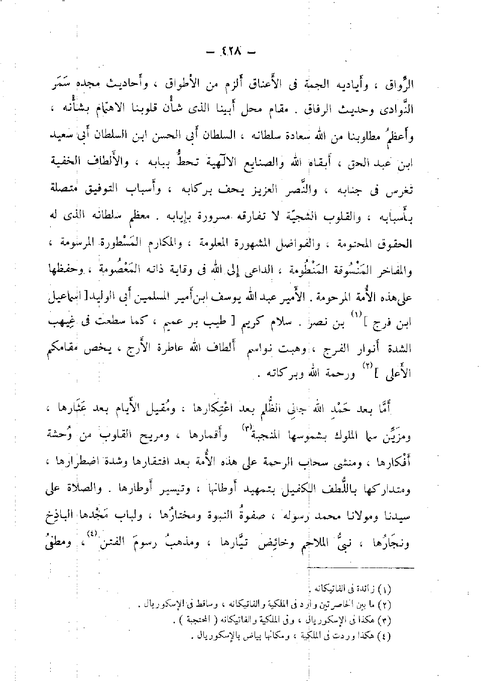 أما بعد حمد الله جالي الظُّلم بعد اعتكارها، ومقيل الْأَيَّام بعد عثارها، ومزين سما الْمُلُوك بشموسها المنجبة وأقمارها، ومريح الْقُلُوب من وَحْشَة أفكارها، ومنشى سَحَاب الرَّحْمَة على هَذِه الْأمة بعد افتقارها وَشدَّة اضطرارها، ومتداركها باللطف الْكَفِيل بتمهيد أوطانها، وتيسير أوطارها. وَالصَّلَاة على سيدنَا ومولانا مُحَمَّد رَسُوله، صفوة النُّبُوَّة ومختارها، ولباب مجدها الباذخ ونجارها، نَبِي الْمَلَاحِم وخائض تيارها، وَمذهب رسوم الْفِتَن، ومطفى