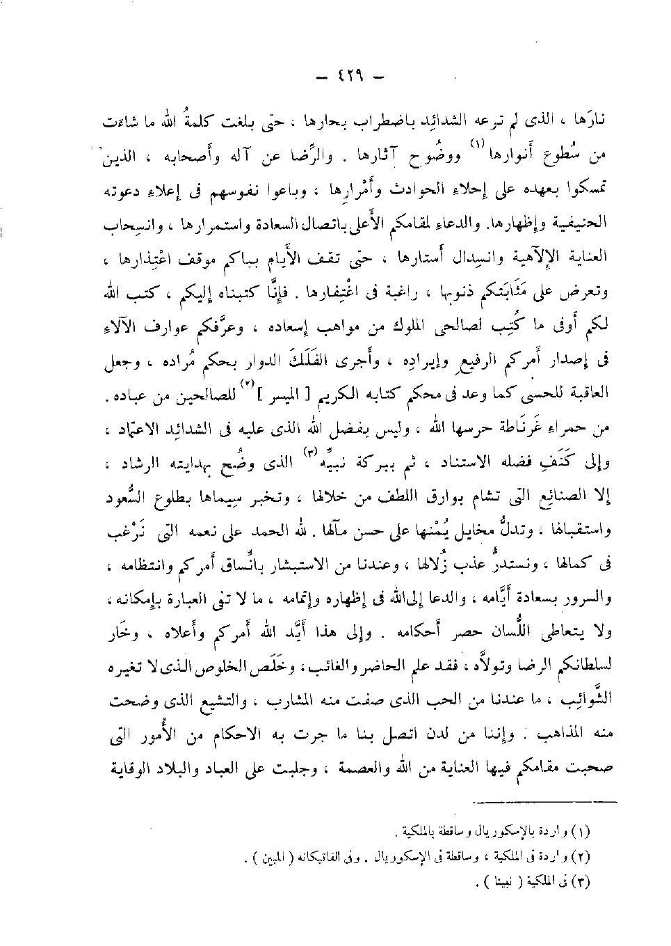 نارها، الَّذِي لم ترعه الشدائد باضطراب بحارها، حَتَّى بلغت كلمة الله مَا شَاءَت من سطوع أنوارها ووضوح آثارها. وَالرِّضَا عَن آله وَأَصْحَابه، الَّذين تمسكوا بعهده على إحلاء الْحَوَادِث وأمرارها، وَبَاعُوا نُفُوسهم فِي إعلاء دَعوته الحنيفية وإظهارها. وَالدُّعَاء لمقامكم الْأَعْلَى باتصال السَّعَادَة واستمرارها، وانسحاب الْعِنَايَة الإلآهية وانسدال أستارها، حَتَّى تقف الْأَيَّام بباكم موقف اعتذارها، وَتعرض على مثابتكم ذنوبها، راغبة فِي اغتفارها. فَإنَّا كتبناه إِلَيْكُم، كتب الله لكم أوفى مَا كتب لصالحي الْمُلُوك من مواهب إسعاده، وعرفكم عوارف الآلاء فِي إصدار أَمركُم الرفيع وإيراده، وأجرى الْفلك الدوار بِحكم مُرَاده، وَجعل الْعَاقِبَة للحسنى كَمَا وعد فِي مُحكم كِتَابه الْكَرِيم [الميسر] للصالحين من عباده. من حَمْرَاء غرناطة حرسها الله، وَلَيْسَ بِفضل الله الَّذِي عَلَيْهِ فِي الشدائد الِاعْتِمَاد، وَإِلَى كنف فَضله الِاسْتِنَاد، ثمَّ ببركة نبيه الَّذِي وضح بهدايته الرشاد، إِلَّا الصَّنَائِع الَّتِي تشام بوارق اللطف من خلالها، وتخبر سيماها بِطُلُوع السُّعُود واستقبالها، وتدل مخايل يمنها على حسن مآلها. لله الْحَمد على نعمه الَّتِي نرغب فِي كمالها، ونستدر عذب زلالها، وَعِنْدنَا من الاستبشار بانساق أَمركُم وانتظامه، وَالسُّرُور بسعادة أَيَّامه، والدعا إِلَى الله فِي إِظْهَاره وإتمامه، مَا لَا تفي الْعبارَة بإمكانه، وَلَا يتعاطى اللِّسَان حصر أَحْكَامه. وَإِلَى هَذَا أيد الله أَمركُم وَأَعلاهُ، وخار لسلطانكم الرِّضَا وتولاه، فقد علم الْحَاضِر وَالْغَائِب، وخلص الخلوص الَّذِي لَا تغيره الشوائب، مَا عندنَا من الْحبّ الَّذِي صفت مِنْهُ المشارب، والتشيع الَّذِي وضحت مِنْهُ الْمذَاهب. وإننا من لدن اتَّصل بِنَا مَا جرت بِهِ الْأَحْكَام من الْأُمُور الَّتِي صَحِبت مقامكم فِيهَا الْعِنَايَة من الله والعصمة، وجلبت على الْعباد والبلاد الْوِقَايَة