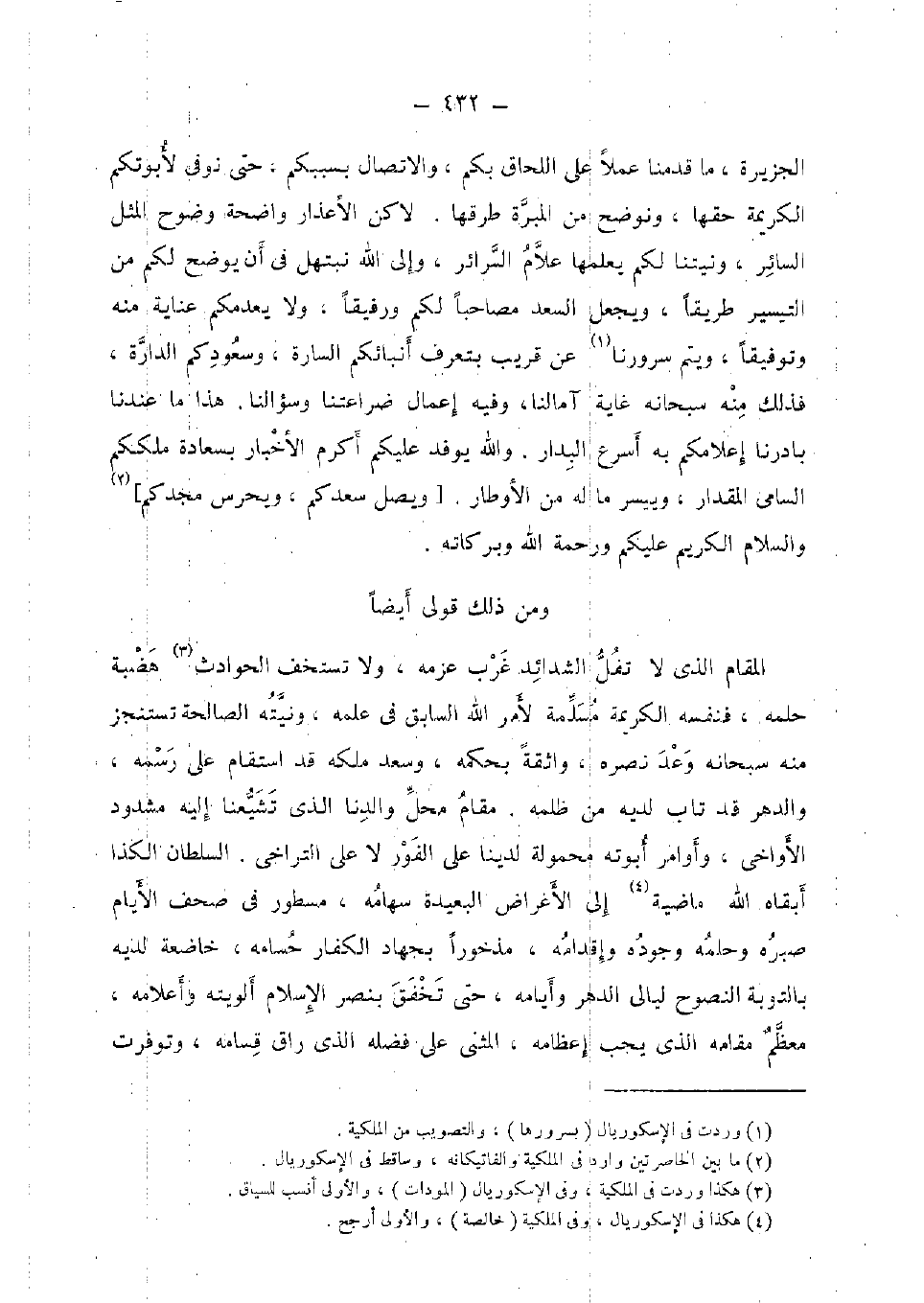 الْمقَام الَّذِي لَا تفل الشدائد غرب عزمه، وَلَا تستخف الْحَوَادِث هضبة حلمه، فنفسه الْكَرِيمَة مسلمة لأمر الله السَّابِق فِي علمه، وَنِيَّته الصَّالِحَة تستنجز مِنْهُ سُبْحَانَهُ وعد نَصره، واثقة بِحكمِهِ، وَسعد ملكه قد استقام على رسمه، والدهر قد تَابَ لَدَيْهِ من ظلمه. مقَام مَحل والدنا الَّذِي تشيعنا إِلَيْهِ مشدود الأواخي، وأوامر أبوته مَحْمُولَة لدينا على الْفَوْر لَا على التَّرَاخِي. السُّلْطَان الكذا أبقاه الله مَاضِيَة إِلَى الْأَغْرَاض الْبَعِيدَة سهامه، مسطور فِي صحف الْأَيَّام صبره وحلمه وجوده وإقدامه، مذخورا بجهاد الْكفَّار حسامه، خاضعة لَدَيْهِ بِالتَّوْبَةِ النصوح ليَالِي الدَّهْر وأيامه، حَتَّى تخفق بنصر الْإِسْلَام ألويته وأعلامه، مُعظم مقَامه الَّذِي يجب إعظامه، الْمثنى على فَضله الَّذِي راق قسامه، وتوفرت
