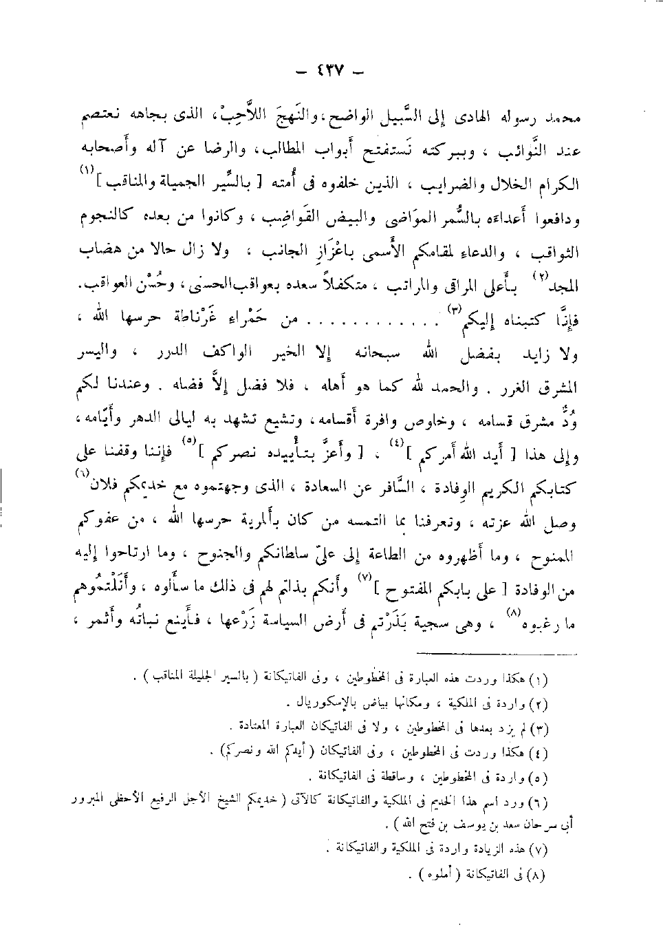 مُحَمَّد رَسُوله الْهَادِي إِلَى السَّبِيل الْوَاضِح، والنهج اللاحب، الَّذِي بجاهه نعتصم عِنْد النوائب، وببركته نستفتح أَبْوَاب المطالب، وَالرِّضَا عَن آله وَأَصْحَابه الْكِرَام الْخلال والضرايب، الَّذين خلفوه فِي أمته [بالسير الجميلة والمناقب] ودافعوا أعداءه بالسمر المواضي وَالْبيض القواضب، وَكَانُوا من بعده كَالنُّجُومِ الثواقب، وَالدُّعَاء لمقامكم الأسمى باعزاز الْجَانِب، ولازال حَالا من هضاب الْمجد بِأَعْلَى المراقي والمراتب، متكفلا سعده بعواقب الْحسنى، وَحسن العواقب، فَإنَّا كتبناه إِلَيْكُم ... ... ... . من حَمْرَاء غرناطة حرسها الله، وَلَا زايد بِفضل الله سُبْحَانَهُ إِلَّا الْخَيْر الواكف الدُّرَر، واليسر الْمشرق الْغرَر. وَالْحَمْد لله كَمَا هُوَ أَهله، فَلَا فضل إِلَى فَضله. وَعِنْدنَا لكم ود مشرق قسامه، وخلوص وافرة أقسامه، وتشيع تشهد بِهِ ليَالِي الدَّهْر وأيامه، وَإِلَى هَذَا [أيد الله أَمركُم] ، [وأعز بتأييده نصركم] فإننا وقفنا على كتابكُمْ الْكَرِيم الْوِفَادَة، السافر عَن السَّعَادَة، الَّذِي وجهتموه مَعَ خديمكم فلَان وصل الله عزته، وتعرفنا بِمَا التمسه من كَانَ بألمرية حرسها الله، من عفوكم الممنوح، وَمَا أظهروه من الطَّاعَة إِلَى على سلطانكم والجنوح، وَمَا ارتاحوا إِلَيْهِ من الْوِفَادَة [على بَابَكُمْ المفتوح] وأنكم بذلتم لَهُم فِي ذَلِك مَا سَأَلُوهُ، وأنلتموهم مَا رغبوه، وَهِي سجية بذرتم فِي أَرض السياسة زَرعهَا، فأينع نَبَاته وأثمر،