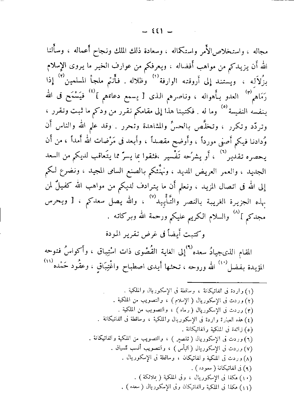 مجاله، واستخلاص الْأَمر واستكماله، وسعادة ذَلِك الْملك ونجاح أَعماله، وَسَأَلنَا الله أَن يزيدكم من مواهب أفضاله، ويعرفكم من عوارف الْخَيْر مَا يرْوى الْإِسْلَام بزلاله، ويستند إِلَى أروقته الوارفة وظلاله. فَأنْتم ملْجأ الْمُسلمين إِذا رماهم الْعَدو بأهواله، وناصرهم الَّذِي [يسمع دعاءهم] فيسمح فِي الله بِنَفسِهِ النفيسة وَمَا لَهُ. فكتبنا هَذَا إِلَى مقامكم نقرر من ودكم مَا ثَبت وتقرر، وَتردد وتكرر، وتخلص بالحس والمشاهدة وتحرر. وَقد علم الله وَالنَّاس أَن ودادنا فِيكُم أصفى موردا، وأوضح مقصدا، وَأبْعد فِي مرضات الله أمدا، من أَن يحصره تَقْدِير، أَو يشرحه تَفْسِير، فثقوا بِمَا يسر مِمَّا يتعاقب لديكم من السعد الْجَدِيد، والعمر العريض المديد، ونهنئكم بالصنع السَّامِي الْمجِيد، ونضرع لكم إِلَى الله فِي اتِّصَال الْمَزِيد، ونعلم أَن مَا يترادف لديكم من مواهب الله كَفِيل لمن بِهَذِهِ الجزيرة الغريبة بالنصر والتأييد، وَالله يصل سعدكم، [ويحرس مجدكم] وَالسَّلَام الْكَرِيم عَلَيْكُم وَرَحْمَة الله وَبَرَكَاته.