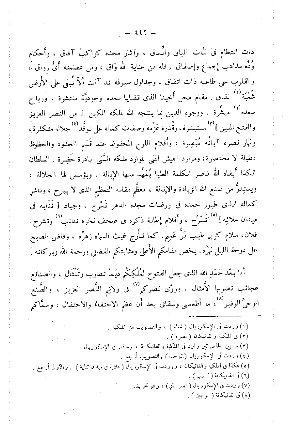 أما بعد حمد الله الَّذِي جعل الْفتُوح لملككم ديما تصوب وتنثال، والصنائع عجائب تضربها الامثال، وروى نصركم فِي ولائم النَّصْر الْعَزِيز، والصنع الْوَحْي الوفير، مَا أطمعني وسقاني بعد أَن عظم الاحتفاء والاحتفال، وسماكم