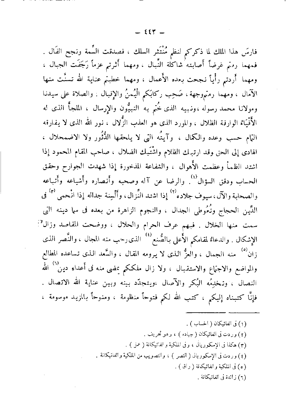 فَارس هَذَا الْملك لما ذكركُمْ لنظم منتشر السلك، فصدقت السمة ونجح الفال. فمهما رمتم غَرضا أَصَابَته شاكلة النبال، وَمهما أثرتم عزما رجفت الجيال، وَمهما أردتم رَأيا نجحت بعده الْأَعْمَال، وَمهما خطبتم عناية الله تسنت مِنْهَا الآمال، وَمهما رمتم وجهة، صحب ركابكم الْيمن والإقبال. وَالصَّلَاة على سيدنَا ومولانا مُحَمَّد رَسُوله، وَنبيه الَّذِي ختم بِهِ النَّبِيُّونَ والإرسال، الملجأ الَّذِي لَهُ الأفياء الوارفة الظلال، والمورد الَّذِي هُوَ العذب الزلَال، نور الله الَّذِي لَا يُفَارِقهُ التَّمام حسب وعده والكمال، وآيته الَّتِي لَا يلْحقهَا الدُّثُور وَلَا الاضمحلال، الْهَادِي إِلَى الْحق وَقد ارتبك الظلام واشتبك الضلال، صَاحب الْمقَام الْمَحْمُود إِذا اشْتَدَّ الظمأ وعظمت الْأَهْوَال، والشفاعة المذخورة إِذا شهِدت الْجَوَارِح وحقق الْحساب ودقق السُّؤَال. وَالرِّضَا عَن آله وَصَحبه وأنصاره وإشاعه وَأَتْبَاعه وَالصَّحَابَة والآل، سيوف جلاده إِذا اشْتَدَّ النزال، وَالسّنة جداله إِذا انحمى فِي الدّين الْحجَّاج وتعوطى الْجِدَال، والنجوم الزاهرة من بعده فِي سما دينه الَّتِي سمت مِنْهَا الْخلال. فبهم عرف الْحَرَام والحلال، ووضحت الْمَقَاصِد وَزَالَ الْإِشْكَال. وَالدُّعَاء لمقامكم الْأَعْلَى بالصنع الَّذِي رحب مِنْهُ المجال، والنصر الَّذِي زَان مِنْهُ الْجمال، والعز الَّذِي لَا يرومه الْمقَال، والسعد الَّذِي تساعده الْمطَالع والمواضع والاجتماع والاستقبال، وَلَا زَالَ ملككم يمْضِي مِنْهُ فِي أَعدَاء دين الله النصال، وتخدمه الْبكر وَالْآصَال، ويتجدد بَينه وَبَين عناية الله الِاتِّصَال. فَإنَّا كتبناه إِلَيْكُم، كتب الله لكم فتوحا منظومة، ومنوحا بالمزيد موسومة،