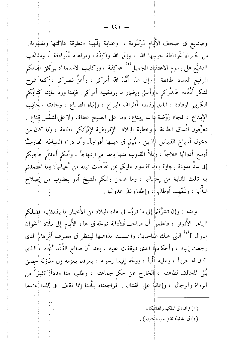 وصنايع فِي صحف الْأَيَّام مرسومة، وعناية إلهية منطوقة دلالتها ومفهومة. من حَمْرَاء غرناطة حرسها الله، وَنعم الله واكفة، ومواهبه مترادفة، ومذاهب التَّشَيُّع على رسوم الِاعْتِقَاد الْجَمِيل عاكفة، وركايب الاستمداد بِرُكْن مقامكم الرفيع الْعِمَاد طَائِفَة. وَإِلَى هَذَا أيد الله أَمركُم، وأعز نصركم، كَمَا شرح لشكر أنعمه صدركم، وَأَعْلَى بإضمار مَا يرتضيه أَمركُم. فإننا ورد علينا كتابكُمْ الْكَرِيم الْوِفَادَة، الَّذِي رقمته أَطْرَاف اليراع، وإنهاء الصناع، وجادته سحائب الإبداع، فجَاء رَوْضَة ذَات إيناع، وَمَا على الصُّبْح غطاء، وَلَا على الشَّمْس قناع. تعرفُون اتساق الطَّاعَة، وخطبة الْبِلَاد الإفريقية لإمرتكم المطاعة، وَمَا كَانَ من دُخُول أَشْيَاخ الْقَبَائِل الَّذين سميتم فِي دينهَا أَفْوَاجًا، وَأَن دَوَاء السياسة الفارسية أوسع أدوائها علاجا، وملأ الْقُلُوب مِنْهَا بعد الْهم ابتهاجا، وأنكم أعدتم حاجبكم إِلَى سد مَدِينَة بجاية بعد الْقدوم عَلَيْكُم بِمن خلصت نِيَّته من أعيانها، وَمَا اعتمدتم بِهِ تِلْكَ المثابة من إحسانها، وَمَا ضمن وَلِيكُم الشَّيْخ أَبُو يَعْقُوب من إصْلَاح شَأْنهَا، وتمهيد أوطانها، وإطفاء نَار عدوانها.