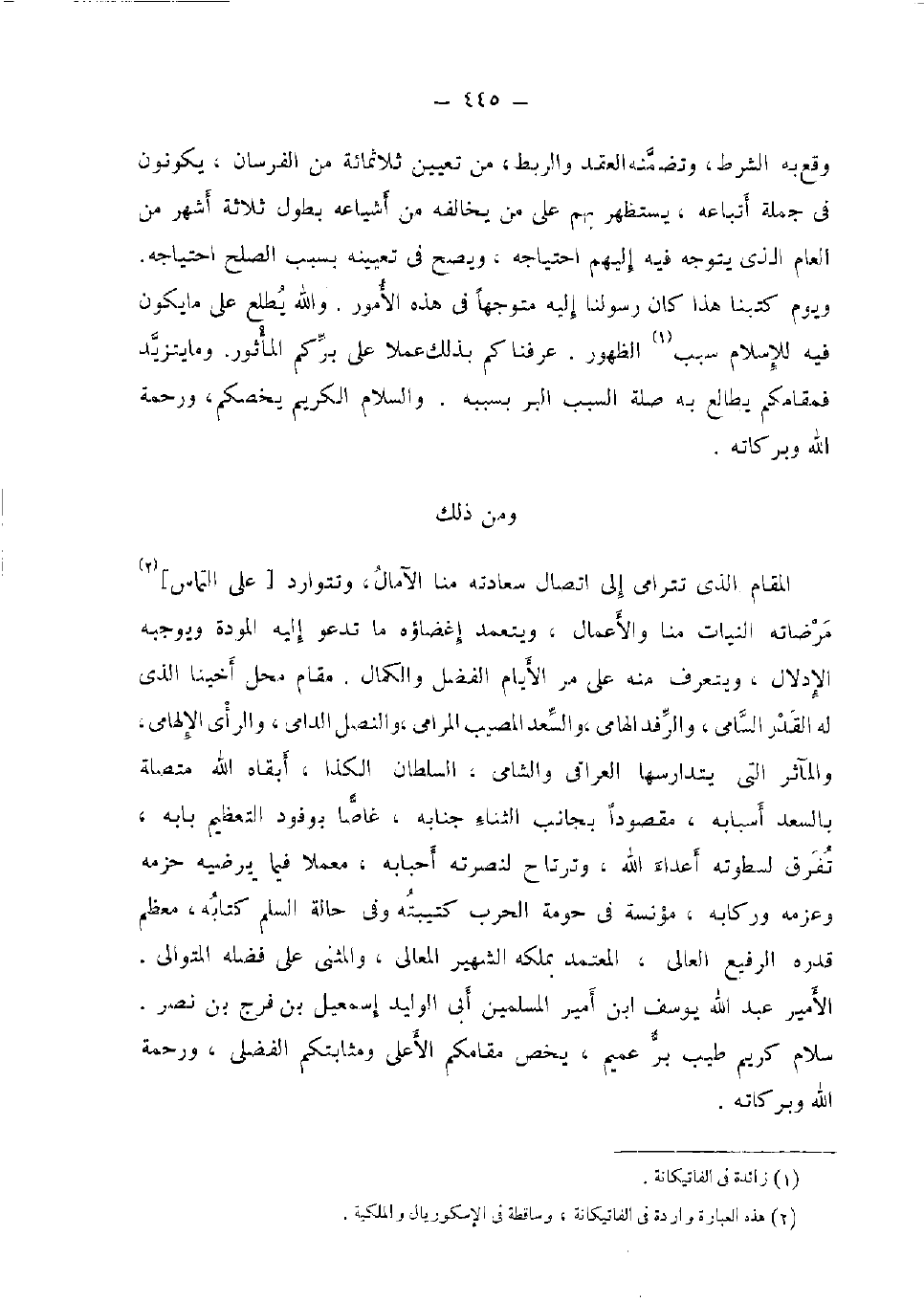 الْمقَام الَّذِي تترامى إِلَى اتِّصَال سعادته منا الآمال، وتتوارد [على التمَاس] مرضاته النيات منا والأعمال، ويتعمد إغضاؤه مَا تَدْعُو إِلَيْهِ الْمَوَدَّة ويوجبه الإدلال، ويتعرف مِنْهُ على مر الْأَيَّام الْفضل والكمال. مقَام مَحل أخينا الَّذِي لَهُ الْقدر السَّامِي، والرفد الهامي، والسعد الْمُصِيب المرامي، والنصل الدامي، والرأي الإلهامي، والمآثر الَّتِي يتدارسها الْعِرَاقِيّ والشامي، السُّلْطَان الكذا، أبقاه الله مُتَّصِلَة بالسعد أَسبَابه، مَقْصُودا بِجَانِب الثَّنَاء جنابه، غاصا بوفود التَّعْظِيم بَابه، تفرق لسطوته أَعدَاء الله، وترتاح لنصرته أحبابه، معملا فِيمَا يرضيه حزمه وعزمه وركابه، مؤنسة فِي حومة الْحَرْب كتيبته وَفِي حَالَة السّلم كِتَابه، مُعظم قدره الرفيع العالي، الْمُعْتَمد بِملكه الشهير الْمَعَالِي، والمثنى على فَضله المتوالي. الْأَمِير عبد الله يُوسُف ابْن أَمِير الْمُسلمين أبي الْوَلِيد إِسْمَعِيل بن فرج بن نصر. سَلام كريم طيب بر عميم، يخص مقامكم الْأَعْلَى ومثابتكم الفضلى، وَرَحْمَة الله وَبَرَكَاته