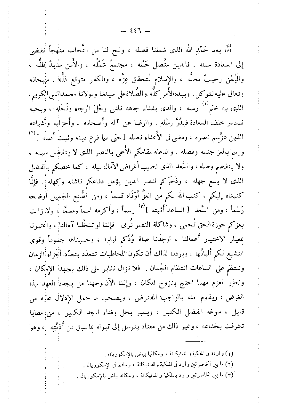 أما بعد حمد الله الَّذِي شملنا فَضله، ونهج لنا من التحاب منهجا تُفْضِي إِلَى السَّعَادَة سبله. فالدين مُتَّصِل حبله، مُجْتَمع شَمله، والأمن مديد ظله، واليمن رحيب مَحَله، وَالْإِسْلَام مُتَحَقق عزه، وَالْكفْر متوقع ذله. سُبْحَانَهُ وَتَعَالَى عَلَيْهِ نتوكل، وَبِيَدِهِ الْأَمر كُله. وَالصَّلَاة على سيدنَا ومولانا مُحَمَّد النَّبِي الْكَرِيم، الَّذِي بِهِ ختم رسله، وَالَّذِي بِفنَاء جاهه نلقى رَحل الرَّجَاء ونحله، وبحبه نستدر خلف السَّعَادَة فيدر رسله. وَالرِّضَا عَن آله وَأَصْحَابه، وأحزابه وأشياعه الَّذين عزبهم نَصره، وَمضى فِي الْأَعْدَاد نصله [حَتَّى سما فرع دينه وَثَبت أَصله] ورسم بالعز جنسه وفصله. وَالدُّعَاء لمقامكم الْأَعْلَى بالنصر الَّذِي لَا ينْفَصل سَببه، وَلَا ينفصم وَصله، والسعد الَّذِي تصيب أغراض الآمال نبله، كَمَا خصكم بِالْفَضْلِ الَّذِي لَا يسع جَهله، وذخركم لنصر الدّين يؤمل دفاعكم ناشئه وكهله. فَإنَّا كتبناه إِلَيْكُم، كتب الله لكم من الْعِزّ أوفاه قسما، وَمن الصنع الْجَمِيل أوضحه رسما، وَمن السعد [المساعد أثْبته] رسما، وأكرمه اسْما ومسما، وَلَا زَالَت بعزكم حوزة الْحق تحمى، وشاكلة النَّصْر ترمى. فإننا لَو تنخلنا آمالنا، واعتبرنا بمعيار الِاخْتِيَار أَعمالنَا، لوجدنا صلَة ودكم لبابها، وحسبناها جسوما وقوى التَّشَيُّع لكم ألبابها، وبودنا لذَلِك أَن تكون المخاطبات تَتَعَدَّد بِتَعَدُّد أَجزَاء الزَّمَان وتنتظم على السَّاعَات انتظام الجمان. فَلَا نزال نثابر على ذَلِك بِجهْد الْإِمْكَان، ونعذر الْعَزْم مهما احْتج بتزوح الْمَكَان، وإننا الْآن وجهنا من يجدد الْعَهْد بِهَذَا الْغَرَض، وَيقوم مِنْهُ بِالْوَاجِبِ المفترض، ويصحب مَا حمل الإدلال عَلَيْهِ من قَلِيل، سوغه الْفضل الْكثير، ويسير بِحل بغناء الْمجد الْكَبِير، من مطايا تشرفت بخدمته، وَغير ذَلِك من مُعْتَاد يتوسل إِلَى قبُوله بِمَا سبق من أذمته، وَهُوَ