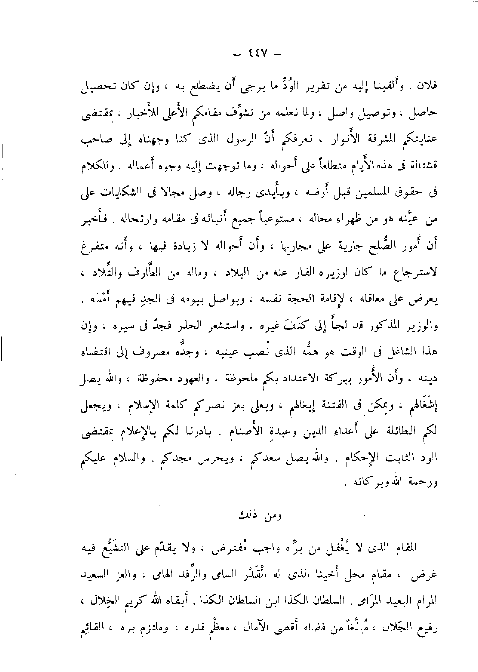 فلَان. وألقينا إِلَيْهِ من تَقْرِير الود مَا يُرْجَى أَن يضطلع بِهِ، وَإِن كَانَ تَحْصِيل حَاصِل، وتوصيل وَاصل، وَلما نعلمهُ من تشوف مقامكم الْأَعْلَى للْأَخْبَار، بِمُقْتَضى عنايتكم المشرقة الْأَنْوَار، نعرفكم أَن الرَّسُول الَّذِي كُنَّا وجهناه إِلَى صَاحب قشتالة فِي هَذِه الْأَيَّام متطلعا على أَحْوَاله، وَمَا تَوَجَّهت إِلَيْهِ وُجُوه أَعماله، وللكلام فِي حُقُوق الْمُسلمين قبل أرضه، وبأيدي رِجَاله، وصل مجالا فِي الشكايات على من عينه هُوَ من ظهراء محاله، مستوعبا جَمِيع أنبائه فِي مقَامه وارتحاله. فَأخْبر أَن أُمُور الصُّلْح جَارِيَة على مجاريها، وَأَن أَحْوَاله لَا زِيَادَة فِيهَا، وَأَنه متفرغ لاسترجاع مَا كَانَ لوزيره الفار عَنهُ من الْبِلَاد، وَمَاله من الطارف والتلاد، يعرض على معاقله، لإِقَامَة الْحجَّة نَفسه، ويواصل بيومه فِي الْجد فيهم أمسه. والوزير الْمَذْكُور قد لَجأ إِلَى كنف غَيره، واستشعر الحذر فجد فِي سيره، وَإِن هَذَا الشاغل فِي الْوَقْت هُوَ همه الَّذِي نصب عَيْنَيْهِ، وجده مَصْرُوف إِلَى اقْتِضَاء دينه، وَأَن الْأُمُور ببركة الِاعْتِدَاد بكم ملحوظة، والعهود مَحْفُوظَة، وَالله يصل إشغالهم، وَيُمكن فِي الْفِتْنَة إيغالهم، ويعلى بعز نصركم كلمة الْإِسْلَام، وَيجْعَل لكم الطائلة على أَعدَاء الدّين وَعَبدَة الْأَصْنَام. بادرنا لكم بالإعلام بِمُقْتَضى الود الثَّابِت الإحكام. وَالله يصل سعدكم، ويحرس مجدكم. وَالسَّلَام عَلَيْكُم وَرَحْمَة الله وَبَرَكَاته.