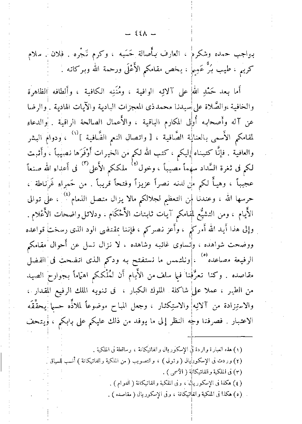 أما بعد حمد الله على آلائه الوافية، ومننه الكافية، وألطافه الظَّاهِرَة والخافية، وَالصَّلَاة على سيدنَا مُحَمَّد ذِي المعجزات الْبَادِيَة والآيات الهادية. وَالرِّضَا عَن آله وَأَصْحَابه أولى المكارم الْبَاقِيَة، والاعمال الصَّالِحَة الراقية. وَالدُّعَاء لمقامكم الأسمى بالعناية الصافية، [واتصال النعم الضافية] ، ودوام الْبشر والعافية. فَإنَّا كتبناه إِلَيْكُم، كتب الله لكم من الْخيرَات أوفرها نَصِيبا، وَأثبت لكم فِي ثغرة السداد سَهْما مصيبا، وخول ملككم الْأَعْلَى فِي أَعدَاء الله صنعا عجيبا، وهيأ لكم من لَدنه نصرا عَزِيزًا وفتحا قَرِيبا. من حَمْرَاء غرناطة، حرسها الله، وعتدنا من التَّعْظِيم لجلالكم مَالا يزَال مُتَّصِل الذمام، على توالي الْأَيَّام، وَمن التَّشَيُّع لمقامكم آيَات ثابتات الْأَحْكَام، وَدَلَائِل واضحات الْأَعْلَام. وَإِلَى هَذَا أيد الله أَمركُم، وأعز نصركم، فإننا بِمُقْتَضى الود الَّذِي رسخت قَوَاعِده ووضحت شواهده، وتساوى غائبه وَشَاهده، لَا نزال نسل عَن أَحْوَال مقامكم الرفيعة مصاعده، ونلتمس مَا نستفتح بِهِ ودكم الَّذِي اتضحت فِي الْفضل مقاصده. وَكُنَّا تعرفنا فِيمَا سلف من الْأَيَّام أَن لملككم اهتماما بجوارح الصَّيْد من الطير، عملا على شاكلة الْمُلُوك الْكِبَار، فِي تنويه الْملك الرفيع الْمِقْدَار، والاستزادة من آلائه والاستكثار، وَجعل الْمُبَاح مَوْضُوعا لملاذه حَسْبَمَا يحققه الِاعْتِبَار. فصرفنا وَجه النّظر إِلَى مَا يوفد من ذَلِك عَلَيْكُم على بَابَكُمْ، ويتحف
