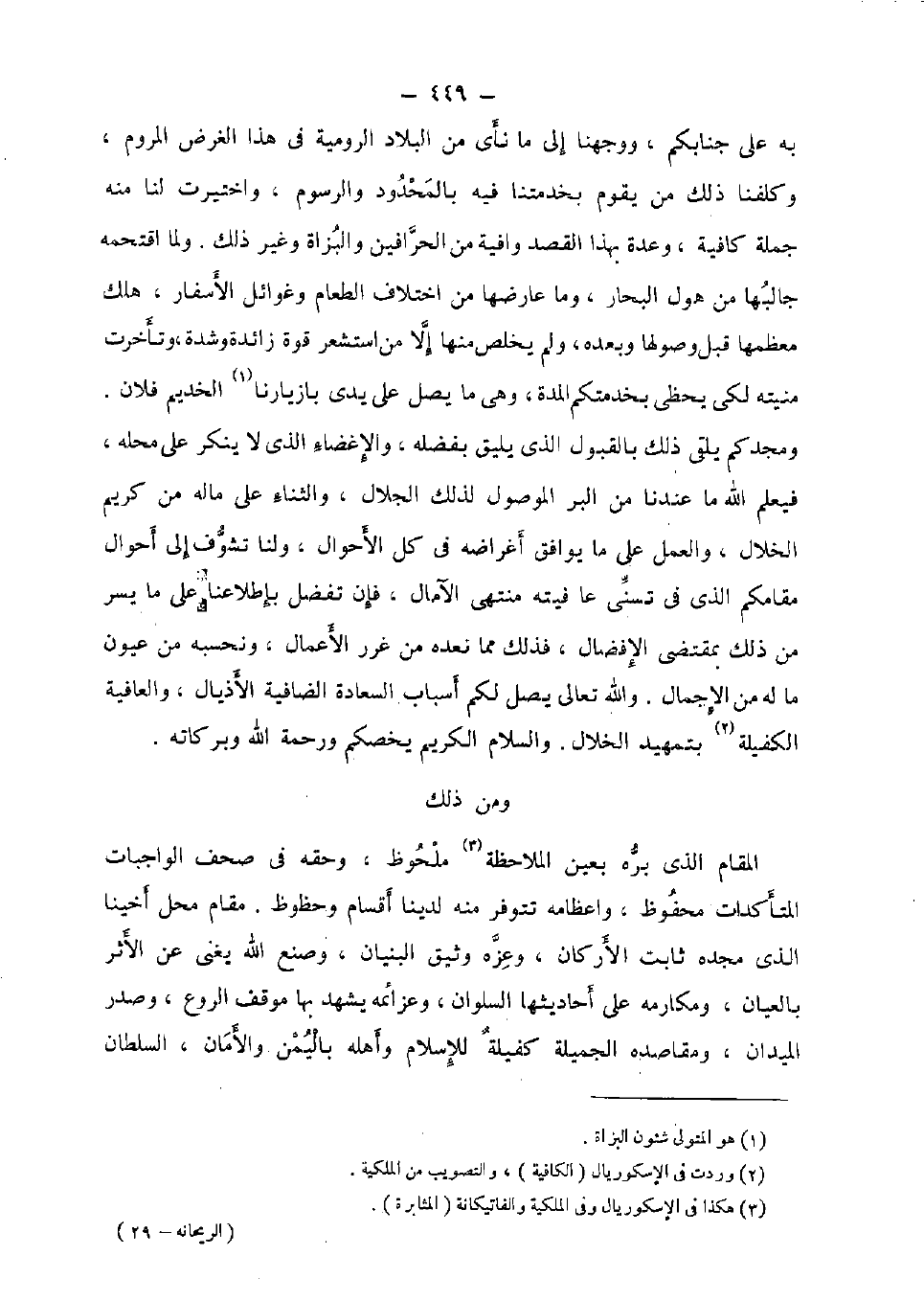 الْمقَام الَّذِي بره بِعَين الملاحظة ملحوظ، وَحقه فِي صحف الْوَاجِبَات المتأكدات مَحْفُوظ، وإعظامه تتوفر مِنْهُ لدينا أَقسَام وحظوظ. مقَام مَحل أخينا الَّذِي مجده ثَابت الْأَركان، وعزه وثيق الْبُنيان، وصنع الله يُغني عَن الْأَثر بالعيان، ومكارمه على أحاديثها السلوان، وعزائمه يشْهد بهَا موقف الروع، وَصدر الميدان، ومقاصده الجميلة كفيلة لِلْإِسْلَامِ وَأَهله بِالْيمن والأمان، السُّلْطَان