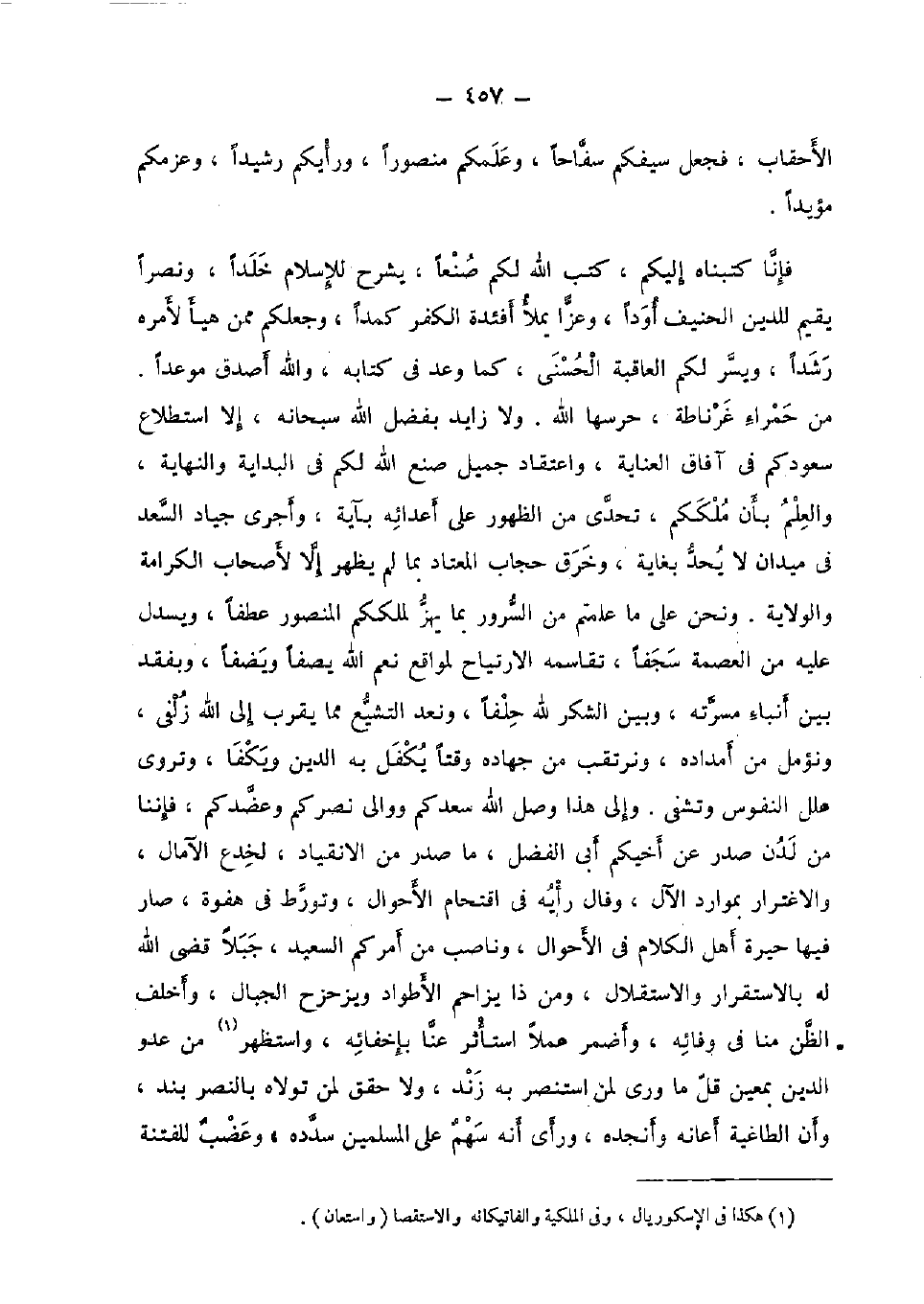 فَإنَّا كتبناه إِلَيْكُم، كتب الله لكم صنعا، يشْرَح لِلْإِسْلَامِ خلدا، ونصرا يُقيم للدّين الحنيف أودا، وَعزا يمْلَأ أَفْئِدَة الْكفْر كمدا، وجعلكم مِمَّن هيأ لأَمره رشدا، وَيسر لكم الْعَاقِبَة الْحسنى، كَمَا وعد فِي كِتَابه، وَالله أصدق موعدا. من حَمْرَاء غرناطة، حرسها الله. وَلَا زايد بِفضل الله سُبْحَانَهُ، إِلَّا استطلاع سعودكم فِي آفَاق الْعِنَايَة، واعتقاد جميل صنع الله لكم فِي الْبِدَايَة وَالنِّهَايَة، وَالْعلم بِأَن ملككم، تحدى من الظُّهُور على أعدائه بِآيَة، وأجرى جِيَاد السعد فِي ميدان لَا يحد بغاية، وخرق حجاب الْمُعْتَاد بِمَا لم يظْهر إِلَّا لأَصْحَاب الْكَرَامَة وَالْولَايَة. وَنحن على مَا علمْتُم من السرُور بِمَا يهز لملككم الْمَنْصُور عطفا، ويسدل عَلَيْهِ من الْعِصْمَة سجفا، تقاسمه الارتياح لمواقع نعم الله يصفا ويضفا، وبفقد بَين أنباء مسرته، وَبَين الشُّكْر لله حلفا، ونعد التَّشَيُّع مِمَّا يقرب إِلَى الله زلفى، ونؤمل من أمداده، ونرتقب من جهاده وقتا يكفل بِهِ الدّين ويكفا، وتروى علل النُّفُوس وتشفى. وَإِلَى هَذَا وصل الله سعدكم ووالى نصركم وعضدكم، فإننا من لدن صدر عَن أخيكم أبي الْفضل، مَا صدر من الانقياد، لخدع الآمال، والاغترار بموارد الْآل، وفال رَأْيه فِي اقتحام الْأَحْوَال، وتورط فِي هفوة، صَار فِيهَا حيرة أهل الْكَلَام فِي الْأَحْوَال، وناصب من أَمركُم السعيد، جبلا قضى الله لَهُ بالاستقرار والاستقلال، وَمن ذَا يزاحم الأطواد ويزحزح الْجبَال، وأخلف الظَّن منا فِي وفائه، وأضمر عملا اسْتَأْثر عَنَّا بإخفانه، وَاسْتظْهر من عَدو الدّين بِمعين قل مَا ورى لمن استنصر بِهِ زند، وَلَا حقق لمن تولاه بالنصر بند، وَأَن الطاغية أَعَانَهُ وأنجده، وَرَأى أَنه سهم على الْمُسلمين سدده، وعضب للفتنة