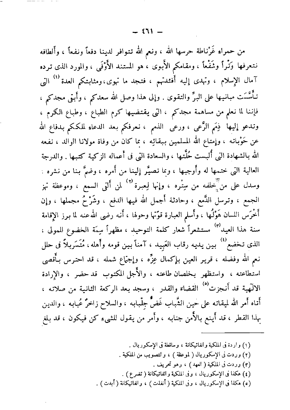 من حَمْرَاء غرناطة حرسها الله، وَنعم الله تتوافر لدينا دفعا ونفعا، وألطافه نتعرفها وترا وشفعا، ومقامكم الابوى، هُوَ الْمُسْتَند الأوفى، والمورد الَّذِي ترده آمال الْإِسْلَام، وتهدي إِلَيْهِ أفئدتهم، فتجد مَا تهوى، ومثابتكم الْعدة الَّتِي تأسست مبانيها على الْبر وَالتَّقوى. وَإِلَى هَذَا وصل الله سعدكم، وَأبقى مجدكم، فإننا لما نعلم من مساهمة مجدكم، الَّتِي يقتضيها كرم الطباع، وطباع الْكَرم، وَتَدْعُو إِلَيْهَا ذمم الرَّاعِي، ورعي الذمم، نعرفكم بعد الدُّعَاء لملككم بدفاع الله عَن حوباته، وإمتاع الله الْمُسلمين بِبَقَائِهِ، بِمَا كَانَ من وَفَاة مَوْلَانَا الْوَالِد، نَفعه الله بِالشَّهَادَةِ الَّتِي ألبست حلتها، والسعادة الَّتِي فِي أَعماله الزكية كتبهَا. والدرجة الْعَالِيَة الَّتِي خَتمهَا لَهُ وأوجبها، وَبِمَا تصير إِلَيْنَا من أمره، وَضم بِنَا من نشره وسدل على من خَلفه من ستره، وَإِنَّهَا لعبرة لمن ألْقى السّمع، وموعظة تهز الْجمع، وَترسل الدمع، وحادثة أجمل الله فِيهَا الدّفع، وَشرح مجملها، وَإِن أخرس اللِّسَان هولها، وَأسلم الْعبارَة قوتها وحولها، أَنه رَضِي الله عَنهُ لما برز الْإِقَامَة سنة هَذَا الْعِيد مستشعرا شعار كلمة التَّوْحِيد، مظْهرا سمة الخضوع للْمولى، الَّذِي تخضع بَين يَدَيْهِ رِقَاب العبيد، آمنا بَين قومه وَأَهله، متسربلا فِي حلل نعم الله وفضله، قرير الْعين بإكمال عزه، واجتماع شَمله، قد احترس بأقصى استطاعته، وَاسْتظْهر بخلصان طَاعَته، وَالْأَجَل الْمَكْتُوب قد حضر، والإرادة الإلهية قد أنجزت الْقَضَاء وَالْقدر، وَسجد بعد الرَّكْعَة الثَّانِيَة من صلَاته، أَتَاهُ أَمر الله لميقاته على حِين الشَّبَاب غض جلبابه، وَالسِّلَاح زاخر عبابه، وَالدّين بِهَذَا الْقطر، قد أينع بالأمن جنابه، وَأمر من يَقُول للشَّيْء كن فَيكون، قد بلغ