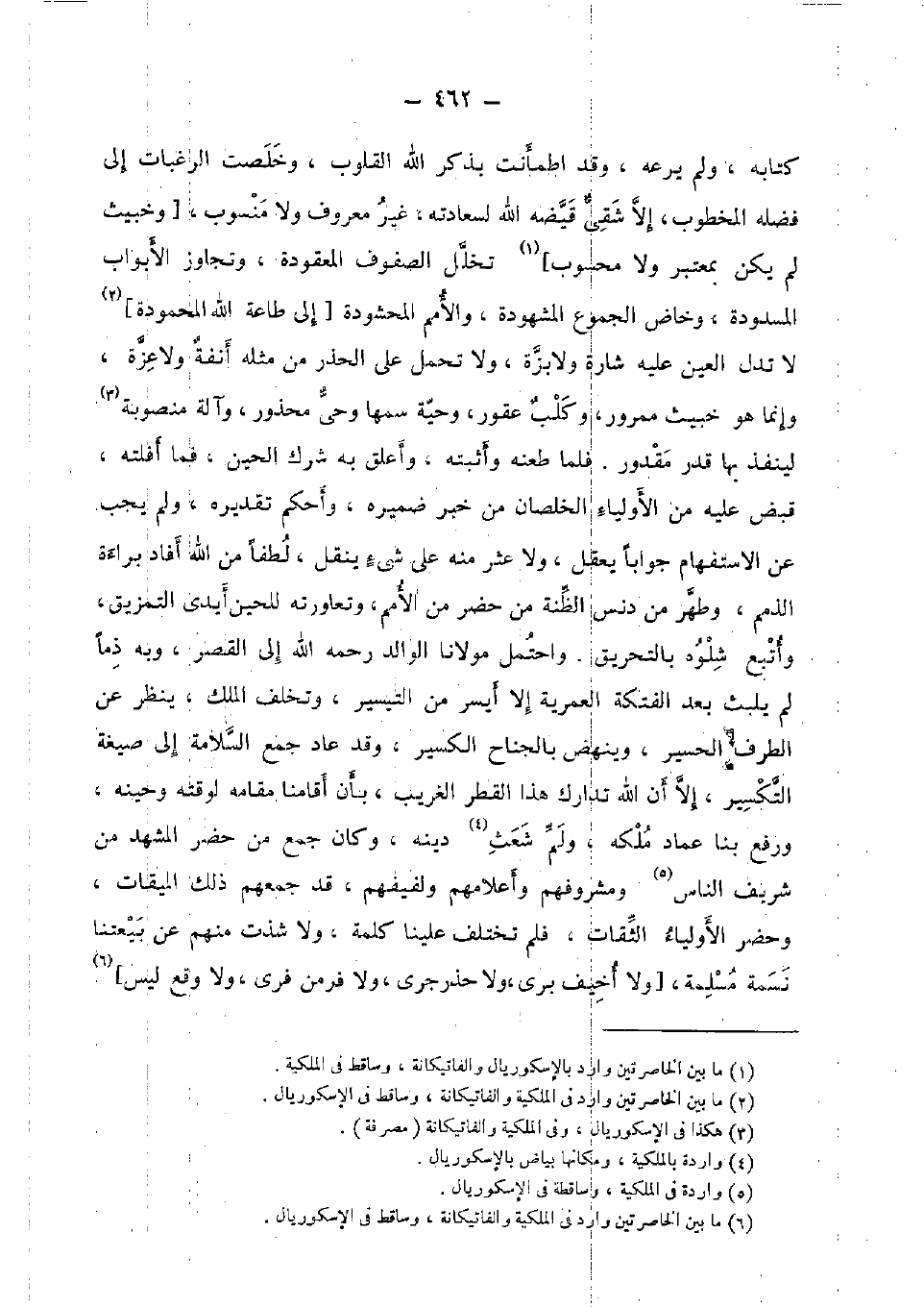كِتَابه، وَلم يرعه، وَقد اطمأنت بِذكر الله الْقُلُوب، وخلصت الرغبات إِلَى فَضله المخطوب، إِلَّا شقي قيضه الله لسعادته، غير مَعْرُوف وَلَا مَنْسُوب، [وخبيث لم يكن بمعتبر وَلَا مَحْسُوب] تخَلّل الصُّفُوف المعقودة، وَتجَاوز الْأَبْوَاب المسدودة، وخاض الجموع المشهودة، والأمم المحشودة [إِلَى طَاعَة الله المحمودة] لَا تدل الْعين عَلَيْهِ شارة وَلَا بزَّة، وَلَا تحمل على الحذر من مثله أَنَفَة وَلَا عزة، وَإِنَّمَا هُوَ خَبِيث ممرور، وكلب عقور، وحية سمها وحى مَحْذُور، وَآلَة مَنْصُوبَة لينفذ بهَا قدر مَقْدُور. فَلَمَّا طعنه وأثبته، وأعلق بِهِ شرك الْحِين، فَمَا أفلته، قبض عَلَيْهِ من الْأَوْلِيَاء الخلصان من خبر ضَمِيره، وَأحكم تَقْدِيره، وَلم يجب عَن الِاسْتِفْهَام جَوَابا يعقل، وَلَا عثر مِنْهُ على شَيْء ينْقل، لطفا من الله أَفَادَ بَرَاءَة الذمم، وطهر من دنس الظنة من حضر من الْأُمَم، وتعاورته للحين أَيدي التمزيق، وأتبع شلوه بالتحريق. وَاحْتمل مَوْلَانَا الْوَالِد رَحمَه الله إِلَى الْقصر، وَبِه ذما لم يلبث بعد الفتكة العمرية إِلَّا أيسر من التَّيْسِير، وتخلف الْملك، ينظر عَن الطّرف الحسير، وينهض بالجناح الكسير، وَقد عَاد جمع السَّلامَة إِلَى صِيغَة التكسير، إِلَّا أَن الله تدارك هَذَا الْقطر الْغَرِيب، بِأَن أقامنا مقَامه لوقته وحينه، وَرفع بِنَا عماد ملكه، وَلم شعث دينه، وَكَانَ جمع من حضر المشهد من شرِيف النَّاس ومشروفهم وأعلامهم ولفيفهم، قد جمعهم ذَلِك الْمِيقَات، وَحضر الْأَوْلِيَاء الثِّقَات، فَلم تخْتَلف علينا كلمة، وَلَا شذت مِنْهُم عَن بيعتنا نسمَة مسلمة، [وَلَا أخيف بَرى، وَلَا حذر جرى، وَلَا فر من فرى، وَلَا وَقع لَيْسَ]