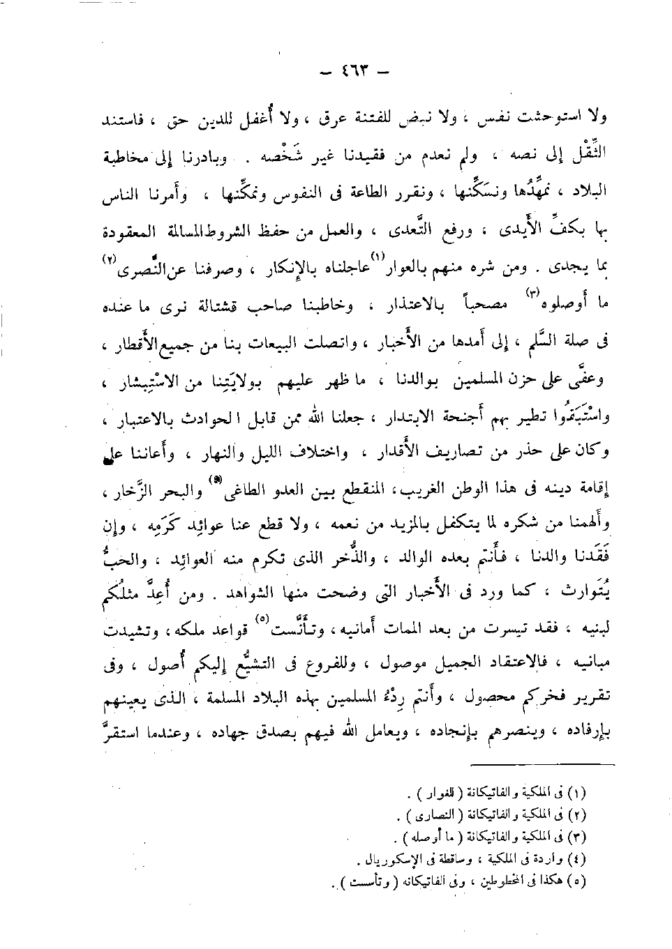 وَلَا استوحشت نفس وَلَا نبض للفتنة عرق، وَلَا أغفل للدّين حق، فاستند الثّقل إِلَى نَصه، وَلم نعدم من فقيدنا غير شخصه. وبادرنا إِلَى مُخَاطبَة الْبِلَاد، فمهدها ونسكنها، ونقرر الطَّاعَة فِي النُّفُوس، ونمكنها، وأمرنا النَّاس بهَا بكف الْأَيْدِي، وَرفع التَّعَدِّي، وَالْعَمَل من حفظ الشُّرُوط المسالمة المعقودة بِمَا يجدي. وَمن شَره مِنْهُم بالعوار عاجلناه بالإنكار، وصرفنا عَن النصرى مَا أوصلوه مصحبا بالاعتذار، وخاطبنا صَاحب قشتالة نرى مَا عِنْده فِي صلَة السّلم، إِلَى أمدها من الْأَخْبَار، واتصلت البيعات بِنَا من جَمِيع الأقطار، وَعفى على حزن الْمُسلمين بوالدنا، مَا ظهر عَلَيْهِم بولايتنا من الاستبشار، واستبقوا تطير بهم أَجْنِحَة الابتدار، جعلنَا الله مِمَّن قَابل الْحَوَادِث بِالِاعْتِبَارِ، وَكَانَ على حذر من تصاريف الأقدار، وَاخْتِلَاف اللَّيْل وَالنَّهَار، وأعاننا على إِقَامَة دينه فِي هَذَا الوطن الْغَرِيب، الْمُنْقَطع بَين الْعَدو الطاغي وَالْبَحْر الزخار، وألهمنا من شكره لما يتكفل بالمزيد من نعمه، وَلَا قطع عَنَّا عوائد كرمه، وَإِن فَقدنَا والدنا، فَأنْتم بعده الْوَالِد، والذخر الَّذِي تكرم مِنْهُ العوائد، وَالْحب يتوارث، كَمَا ورد فِي الاخبار الَّتِي وضحت مِنْهَا الشواهد. وَمن أعد مثلكُمْ لِبَنِيهِ، فقد تيسرت من بعد الْمَمَات أمانيه، وتأنست قَوَاعِد ملكه، وتشيدت مبانيه، فالاعتقاد الْجَمِيل مَوْصُول، وللفروع فِي التَّشَيُّع إِلَيْكُم أصُول، وَفِي تَقْرِير فخركم محصول، وَأَنْتُم ردء الْمُسلمين بِهَذِهِ الْبِلَاد الْمسلمَة، الَّذِي يعينهم بإرفاده، وَيَنْصُرهُمْ بإنجاده، ويعامل الله فيهم بِصدق جهاده، وعندما اسْتَقر