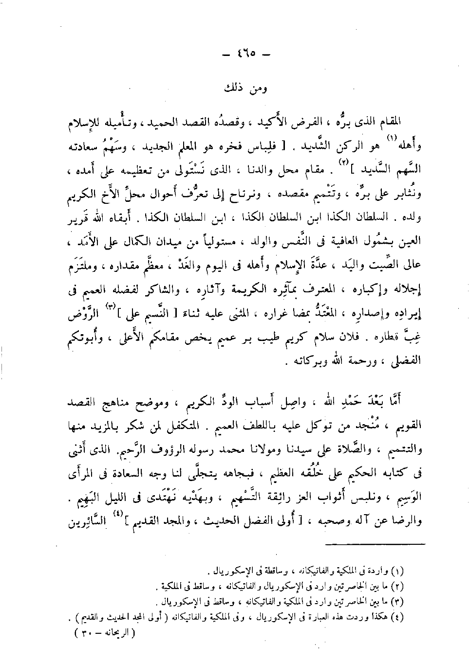 وَمن ذَلِك الْمقَام الَّذِي بره، الْفَرْض الأكيد، وقصده الْقَصْد الحميد، وتأمليه لِلْإِسْلَامِ وَأَهله هُوَ الرُّكْن الشَّديد. [فلباس فخره هُوَ الْمعلم الْجَدِيد، وَسَهْم سعادته السهْم السديد] . مقَام مَحل والدنا، الَّذِي نستولي من تَعْظِيمه على أمده، ونثابر على بره، وتتميم مقْصده، ونرتاح إِلَى تعرف أَحْوَال مَحل الْأَخ الْكَرِيم وَلَده. السُّلْطَان الكذا ابْن السُّلْطَان الكذا، ابْن السُّلْطَان الكذا. أبقاه الله قرير الْعين بشمول الْعَافِيَة فِي النَّفس وَالْولد، مستوليا من ميدان الْكَمَال على الْمَدّ، عالى الصيت وَالْيَد، عدَّة الْإِسْلَام وَأَهله فِي الْيَوْم والغد، مُعظم مِقْدَاره، وملتزم إجلاله وإكباره، الْمُعْتَرف بمآثره الْكَرِيمَة وآثاره، والشاكر لفضله العميم فِي إِيرَاده وإصداره، الْمُعْتَمد بمضا غراره، الْمثنى عَلَيْهِ ثَنَاء [النسيم على] الرَّوْض غب قطاره. فلَان سَلام كريم طيب بر عميم يخص مقامكم الْأَعْلَى، وأبوتكم الفضلى، وَرَحْمَة الله وَبَرَكَاته.