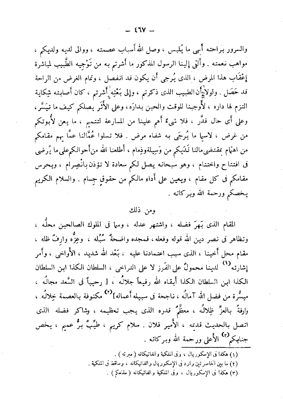 وَالسُّرُور براحته أبهى مَا يلبس، وصل الله أَسبَاب عصمته، ووالى لَدَيْهِ ولديكم، مواهب نعْمَته. وَألقى إلنيا الرَّسُول الْمَذْكُور مَا اشرتم بِهِ من تَوْجِيه الطَّبِيب لمباشرة إعقاب هَذَا الْمَرَض، الَّذِي يُرْجَى أَن يكون قد انْفَصل، وَتَمام الْغَرَض من الرَّاحَة قد حصل. وَلَوْلَا أَن الطَّبِيب الَّذِي ذكرْتُمْ، وَإِلَى بَعثه أشرتم، كَانَ أَصَابَته شكاية الْتزم لَهَا دَاره، لأوجبنا للْوَقْت والحين بداره، وعَلى الْأَثر يصلكم كَيفَ مَا تيَسّر، وعَلى أَي حَال قدر، فَلَا شَيْء أهم علينا من المسارعة لتتميم، مَا يعن لأبوتكم من غَرَض، لَا سِيمَا مَا يُرْجَى بِهِ شِفَاء مرض. فَلَا تسلوا عمالنا عَمَّا يهم مقامكم من اهتمام بِمُقْتَضى مالنا لديكم من وَسِيلَة وذمام، أطْلعنَا الله من أحوالكم على مَا يرضى فِي افْتِتَاح واختتام، وَهُوَ سُبْحَانَهُ يصل لكم سَعَادَة لَا تؤذن بانصرام، ويحرس مقامكم فِي كل مقَام، ويعين على أَدَاء مالكم من حُقُوق جسام. وَالسَّلَام الْكَرِيم يخصكم وَرَحْمَة الله وَبَرَكَاته.