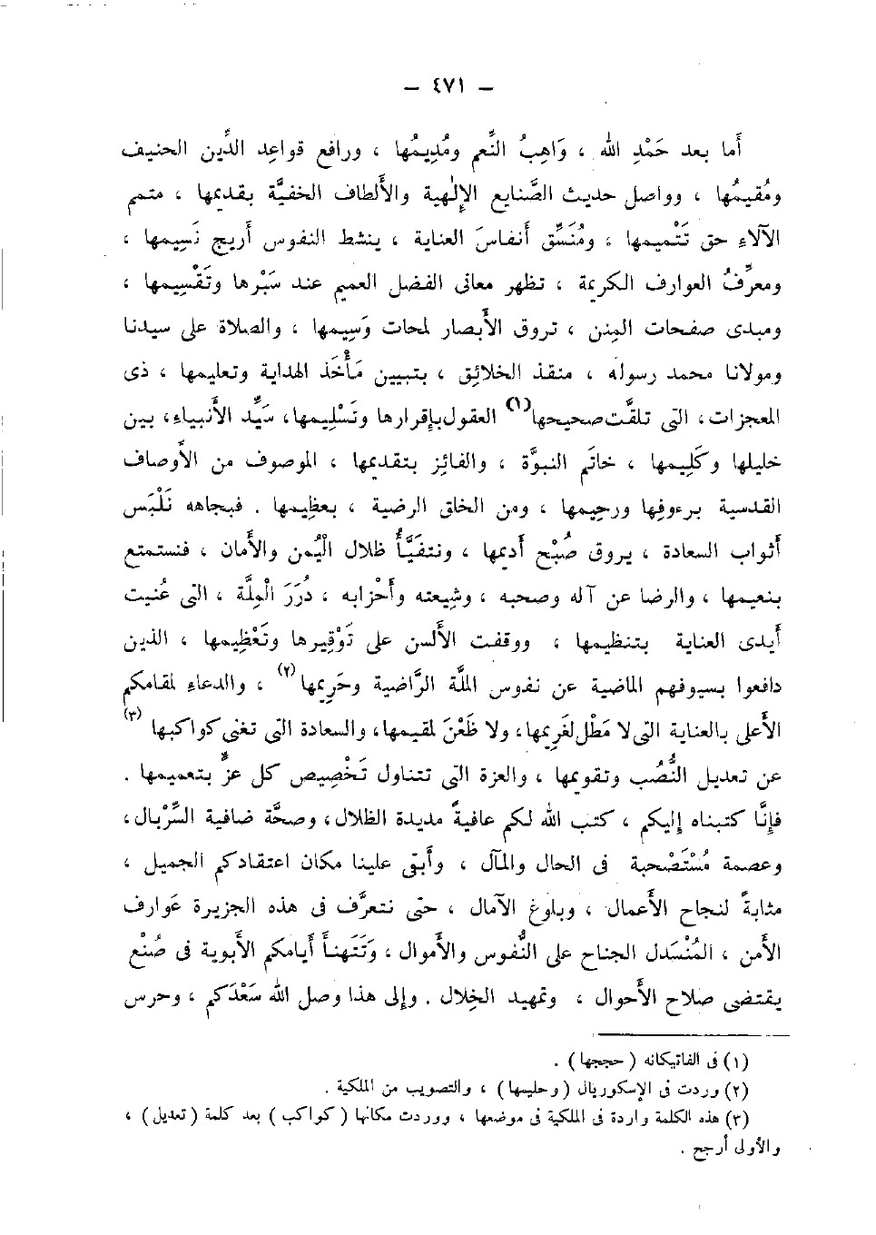 أما بعد حمد الله، واهب النعم ومديمها، وَرَافِع قَوَاعِد الدّين الحنيف ومقيمها، وواصل حَدِيث الصنايع الإلهية والألطاف الْخفية بقديمها، متمم الآلاء حق تتميمها، ومنسق أنفاس الْعِنَايَة، ينشط النُّفُوس أريج نسيمها، ومعرف العوارف الْكَرِيمَة، تظهر مَعَاني الْفضل العميم عِنْد سبرها وتقسيمها، ومبدي صفحات المنن، تروق الْأَبْصَار لمحات وسيمها، وَالصَّلَاة على سيدنَا ومولانا مُحَمَّد رَسُوله، منقذ الْخَلَائق، بتبيين مَأْخَذ الْهِدَايَة وَتَعْلِيمهَا، ذِي المعجزات، الَّتِي تلقت صحيحها الْعُقُول بإقرارها وتسليمها، سيد الْأَنْبِيَاء، بَين خليلها وكليمها، خَاتم النُّبُوَّة، والفائز بتقديمها، الْمَوْصُوف من الْأَوْصَاف القدسية برءوفها ورحيمها، وَمن الْخلق الرضية، بعظيمها. فبجاهه نلبس أَثوَاب السَّعَادَة، يروق صبح أديمها، ونتفيأ ظلال الْيمن والأمان، فنستمتع بنعيمها، وَالرِّضَا عَن آله وَصَحبه، وشيعته وأحزابه، دُرَر الْملَّة، الَّتِي عنيت أَيدي الْعِنَايَة بتنظيمها، ووقفت الألسن على توقيرها وتعظيمها، الَّذين دافعوا بسيوفهم الْمَاضِيَة عَن نفوس الْملَّة الراضية وحريمها، وَالدُّعَاء لمقامكم الْأَعْلَى بالعناية الَّتِي لَا مطل لغريمها، وَلَا ظعن لمقيمها، والسعادة الَّتِي تغني كواكبها عَن تَعْدِيل النصب وتقويمها، والعزة الَّتِي تتَنَاوَل تَخْصِيص كل عز بتعميمها. فَإنَّا كتبناه إِلَيْكُم، كتب الله لكم عَافِيَة مديدة الظلال، وَصِحَّة ضافية السربال، وعصمة مستصحبة فِي الْحَال والمآل، وَأبقى علينا مَكَان اعتقادكم الْجَمِيل، مثابة لنجاح الْأَعْمَال، وبلوغ الآمال، حَتَّى نتعرف فِي هَذِه الجزيرة عوارف الْأَمْن، المنسدل الْجنَاح على النُّفُوس وَالْأَمْوَال، وتتهنأ أيامكم الأبوية فِي صنع يَقْتَضِي صَلَاح الْأَحْوَال، وتمهيد الْخلال. وَإِلَى هَذَا وصل الله سعدكم، وحرس