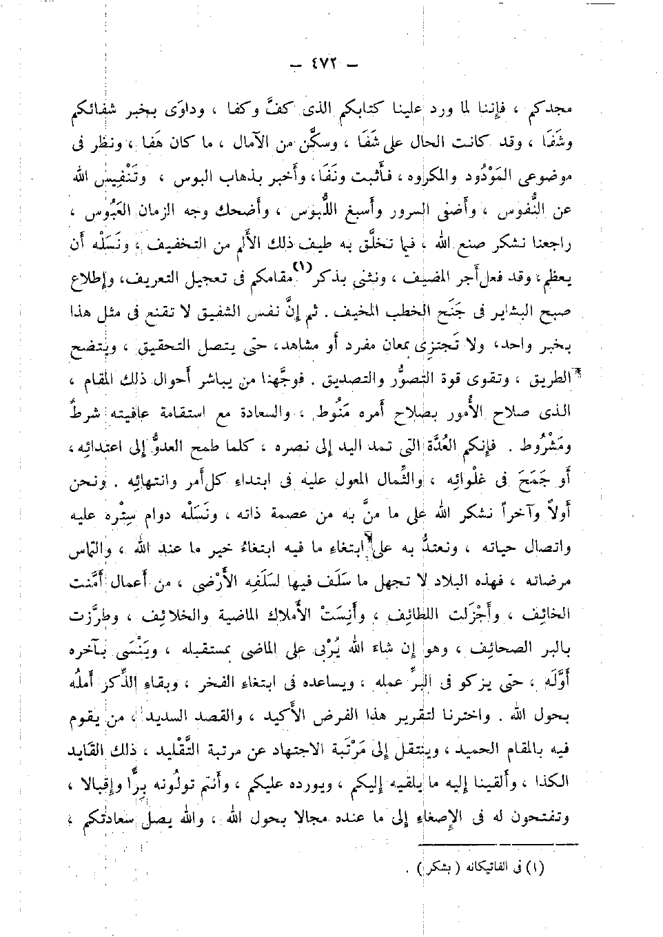 مجدكم، فإننا لما ورد علينا كتابكُمْ الَّذِي كف وكفا، وداوى بِخَبَر شفائكم وشفا، وَقد كَانَت الْحَال على شفا، وَسكن من الآمال، مَا كَانَ هفا، وَنظر فِي موضوعي المودود وَالْمَكْرُوه، فَأثْبت ونفا، وَأخْبر بذهاب البوس، وتنفيس الله عَن النُّفُوس، وأضفى السرُور وأسبغ اللبوس، وأضحك وَجه الزَّمَان العبوس، راجعنا نشكر صنع الله، فِيمَا تخلق بِهِ طيف ذَلِك الْأَلَم من التَّخْفِيف، ونسله أَن يعظم، وَقد فعل أجر المضيف، ونثني بِذكر مقامكم فِي تَعْجِيل التَّعْرِيف، وإطلاع صبح البشاير فِي جنح الْخطب المخيف. ثمَّ إِن نفس الشفيق لَا تقنع فِي مثل هَذَا بِخَبَر وَاحِد، وَلَا تجتزى بمعان مُفْرد أَو مشَاهد، حَتَّى يتَّصل التَّحْقِيق، ويتضح الطَّرِيق، وتقوى قُوَّة التَّصَوُّر والتصديق. فوجهنا من يُبَاشر أَحْوَال ذَلِك الْمقَام، الَّذِي صَلَاح الْأُمُور بصلاح أمره مَنُوط، والسعادة مَعَ استقامة عافيته شَرط ومشروط. فَإِنَّكُم الْعدة الَّتِي تمد الْيَد إِلَى نَصره، كلما طمح الْعَدو إِلَى اعتدائه، أَو جمع فِي غلوائه، والثمال الْمعول عَلَيْهِ فِي ابْتِدَاء كل أَمر وانتهائه. وَنحن أَولا وآخرا نشكر الله على مَا من بِهِ من عصمَة ذَاته، ونسله دوَام ستره عَلَيْهِ واتصال حَيَاته، ونعتد بِهِ على ابْتِغَاء مَا فِيهِ ابْتِغَاء خير مَا عِنْد الله، والتماس مرضاته، فَهَذِهِ الْبِلَاد لَا تجْهَل مَا سلف فِيهَا لسلفه الأرضي، من أَعمال أمنت الْخَائِف، وأجزلت اللطائف، وأنست الْأَمْلَاك الْمَاضِيَة والخلائف، وطرزت بِالْبرِّ الصحائف، وَهُوَ إِن شَاءَ الله يُربي على الْمَاضِي بمستقبله، وينسى بِآخِرهِ أَوله، حَتَّى يزكو فِي الْبر عمله، ويساعده فِي ابْتِغَاء الْفَخر، وَبَقَاء الذّكر أمله بحول الله. واخترنا لتقرير هَذَا الْفَرْض الأكيد، وَالْقَصْد السديد، من يقوم فِيهِ بالْمقَام الحميد، وينتقل إِلَى مرتبَة الِاجْتِهَاد عَن مرتبَة التَّقْلِيد، ذَلِك القايد الكذا، وألقينا إِلَيْهِ مَا يلقيه إِلَيْكُم، ويورده عَلَيْكُم، وَأَنْتُم تولونه برا وإقبالا، وتفتحون لَهُ فِي الإصغاء إِلَى مَا عِنْده مجالا بحول الله، وَالله يصل سعادتكم،