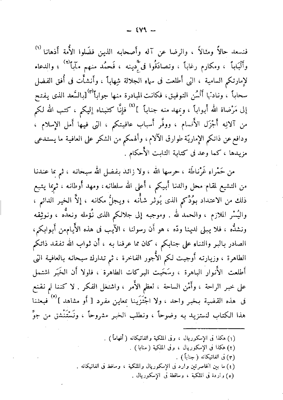 فنسعد حَالا ومثالا، وَالرِّضَا عَن آله وَأَصْحَابه الَّذين فضلوا الْأمة أذهانا وألبابا، وَمَكَارِم رغابا، وتصادقوا فِي دينه، فَحَمدَ مِنْهُم مآبا؛ وَالدُّعَاء لإمارتكم السامية، الَّتِي أطلعت فِي سَمَاء الْجَلالَة شهابا، وأنشأت فِي أفق الْفضل سحابا، ونادتها ألسن التَّوْفِيق، فَكَانَت الْمُبَادرَة مِنْهَا جَوَابا [بالسعد الَّذِي يفتح إِلَى مرضاة الله أبوابا، ويمهد مِنْهُ جنابا] فَإنَّا كتبناه إِلَيْكُم، كتب الله لكم من آلائه أجزل الْأَقْسَام، ووفر أَسبَاب عافيتكم، الَّتِي فِيهَا أمل الْإِسْلَام، ودافع عَن ذاتكم الإمارية طوارق الآلام، وألهمكم من الشُّكْر على الْعَافِيَة مَا يستدعى مزيدها، كَمَا وعد فِي كِتَابَة الثَّابِت الْأَحْكَام.