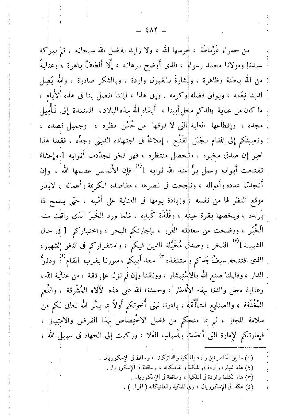 من حَمْرَاء غرناطة، حرسها الله، وَلَا زايد بِفضل الله سُبْحَانَهُ، ثمَّ ببركة سيدنَا ومولانا مُحَمَّد رَسُوله، الَّذِي أوضح برهانه، إِلَّا ألطاف باهرة، وعناية من الله باطنة وظاهرة، وَبشَارَة بِالْقبُولِ وَارِدَة، وبالشكر صادرة، وَالله يصل لدينا نعمه، ويوالي فَضله وَكَرمه. وَإِلَى هَذَا، فإننا اتَّصل بِنَا فِي هَذِه الْأَيَّام، مَا كَانَ من عناية والدكم مَحل أَبينَا، أبقاه الله بِهَذِهِ الْبِلَاد، المستندة إِلَى تأميل مجده، وإقطاعها الْغَايَة الَّتِي لَا فَوْقهَا من حسن نظره، وَجَمِيل قَصده، وتعيينكم إِلَى الْمقَام بجبل الْفَتْح، إبلاغا فِي اجْتِهَاده الديني وجده، فَقُلْنَا هَذَا خبر إِن صدق مخبره، وَتحصل منتظره، فَهُوَ فَخر تَجَدَّدَتْ أثوابه [وإعشاء تفتحت أبوابه وَعمل بر عِنْد الله ثَوَابه] فَإِن الأندلس عصمها الله، وَإِن أنجدتها عدده وأمواله، ونجحت فينصرها، مقاصده الْكَرِيمَة وأعماله، لَا يذر موقع النّظر لَهَا من نَفسه، وَزِيَادَة يَوْمهَا فِي الْعِنَايَة على أمسه، حَتَّى يسمح لَهَا بولده، ويخصها بقرة عينه، وفلذة كبده، فَلَمَّا ورد الْخَبَر الَّذِي راقت مِنْهُ الْخَبَر، ووضحت من سعادته الْغرَر، بإجازتكم الْبَحْر، واختياركم [فِي حَال الشبيبة] الْفَخر، وَصدق مخيلة الدّين فِيكُم، واستقراركم فِي الثغر الشهير، الَّذِي افتتحه سيف جدكم واستنقذه سعد أبيكم، سررنا بِقرب الْمقَام ودنو الدَّار، وقابلنا صنع الله بالاستبشار، ووثقنا وَإِن لم نزل على ثِقَة، من عناية الله، وعناية مَحل والدنا بِهَذِهِ الأقطار، وحمدنا الله على هَذِه الآلاء المشرقة، وَالنعَم المغدقة، والصنايع المتألقة، بادرنا نهني أخوتكم أَولا بِمَا يسر الله تَعَالَى لكم من سَلامَة الْمجَاز، ثمَّ بِمَا منحكم من فضل الِاخْتِصَاص بِهَذَا الْفَرْض والامتياز، فإمارتكم الْإِمَارَة الَّتِي أخذت بِأَسْبَاب الْعلَا، وَركبت إِلَى الْجِهَاد فِي سَبِيل الله،