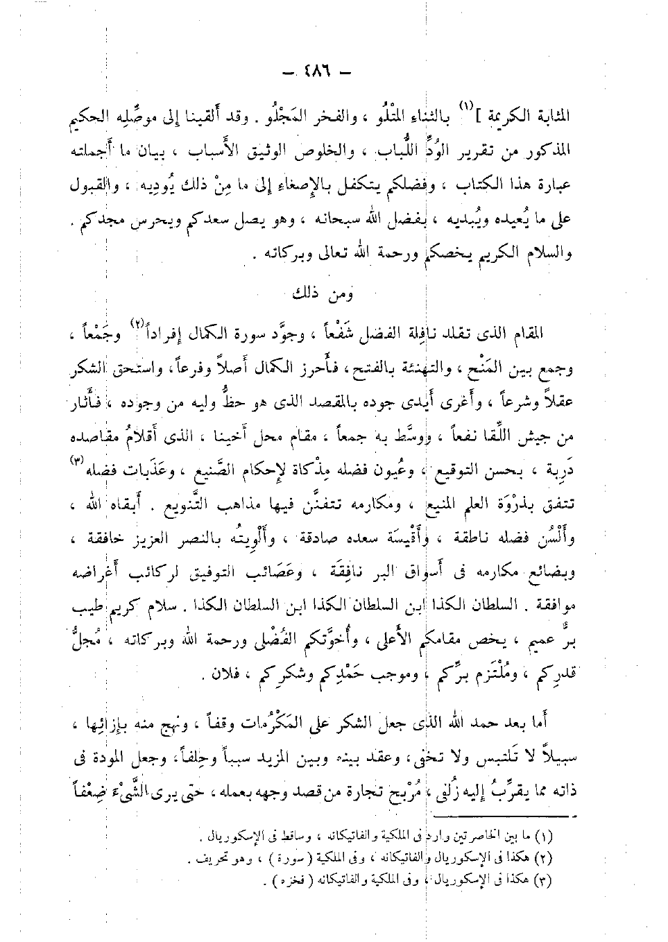 الْمقَام الَّذِي تقلد نَافِلَة الْفضل شفعا، وجود سُورَة الْكَمَال إفرادا وجمعا، وَجمع بَين الْمنح، والتهنئة بِالْفَتْح، فأحرز الْكَمَال أصلا وفرعا، وَاسْتحق الشُّكْر عقلا وَشرعا، وأغرى ايدى جوده بالمقصد الَّذِي هُوَ حَظّ وليه من وجوده، فأثار من جَيش اللقا نفعا، ووسط بِهِ جمعا، مقَام مَحل أخينا، الَّذِي أَقْلَام مقاصده دربة، بِحسن التوقيع، وعيون فَضله مذكاة لإحكام الصَّنِيع، وعذبات فَضله تنْفق بِذرْوَةِ الْعلم المنيع، ومكارمه تتفنن فِيهَا مَذَاهِب التنويع. أبقاه الله، وألسن فَضله ناطقة، وأقيسه سعده صَادِقَة، وألويته بالنصر الْعَزِيز خافقة، وبضائع مكارمه فِي أسواق الْبر نافقة، وعصائب التَّوْفِيق لركائب أغراضه مُوَافقَة. السُّلْطَان الكذا ابْن السُّلْطَان الكذا ابْن السُّلْطَان الكذا. سَلام كريم طيب بر عميم، يخص مقامكم الْأَعْلَى، وأخوتكم الفضلى وَرَحْمَة الله وَبَرَكَاته، مجل قدركم، وملتزم بركم، وَمُوجب حمدكم وشكركم، فلَان.
