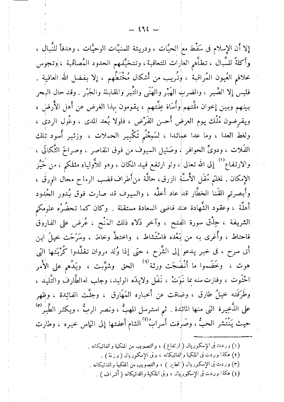 إِلَّا أَن الْإِسْلَام فِي سفط مَعَ الْحَيَّات، ودريئة للمنيات الوحيات، وهدفا للنبال، وأكلة للسبال، تَطَأهُمْ الغارات المتعاقبة، وتتخيفهم الْحُدُود المصاقبة، وتجوس خلالهم الْعُيُون المراقبة، وتريب من أشكال مختطهم، إِلَّا بِفضل الله الْعَافِيَة. فَلَيْسَ إِلَّا الصَّبْر، وَالضَّرْب الهبر والهنى والتبر والمقابلة والجبر. وَقد حَال الْبَحْر بَينهم وَبَين إخْوَان ملتهم وأساة علتهم، يقومُونَ بِهَذَا الْغَرَض عَن أهل الأَرْض، ويقرضون ملك يَوْم الْعرض أحسن الْقَرْض، فلولا بعد المدى، وغول الردى، ولغط العدا، وَمَا عدا عمائدا، لسمعتم تَكْبِير الحملات، وزئير أسود تِلْكَ الفلات، ودوى الحوافر، وصليل السيوف من فَوق المقاصر، وصراخ الثكالى، والارتفاع إِلَى الله تَعَالَى، وَلَو ارْتَفع قيد الْمَكَان، وَهُوَ للأولياء مثلكُمْ، من حيّز الْإِمْكَان. لمغلتم مقل الأسنة الزرق، حَالَة من أَطْرَاف قضب الرماح محَال الْوَرق، وأبصرتم القنا الخطار قد عَاد أخله، وَالسُّيُوف قد صَارَت فَوق بدور الْحُدُود أهلة، وعقود الشَّهَادَة عِنْد قَاضِي السَّعَادَة مُسْتَقلَّة. وَكَانَ كَمَا تحضره علومكم الشَّرِيفَة، حذق سُورَة الْفَتْح، وَآخر دلاء ذَلِك الْمنح، عرض على الْفَارُوق فاحتاط، وأغرى بِهِ من بعده فاستشاط، واختط وخاط، وسرحت خيل ابْن أبي سرح، فِي خبر يَدْعُو إِلَى الشَّرْح، حَتَّى إِذا ولد مَرْوَان تقلدوا كربتها الَّتِي هوت، وخضموا مَا أنضجت وَرَثَة الْحق وشوبت، ويدهم على الْأَمر احتوت، وفازت مِنْهُ بِمَا نَوَت، نفل ولايده الْوَلِيد، وجلب لَهُ الطارف والتليد، وطرقته خيل طَارق، وَضَاقَتْ عَن أخباره المهارق، وجلت الْفَائِدَة، وَظهر على الذَّخِيرَة الَّتِي مِنْهَا الْمَائِدَة. ثمَّ استرسل المهب، وَنصر الرب، وَيكثر الطير حَيْثُ ينتشر الْحبّ، وصرفت أسراب الشَّام أعفتها إِلَى التمَاس خَيره، وطارت