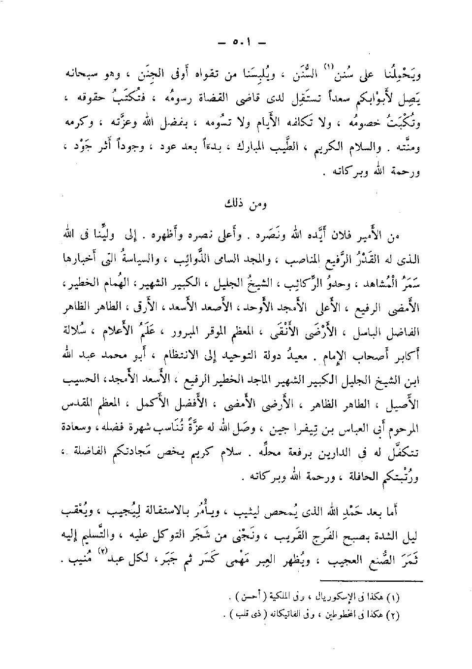 من الْأَمِير فلَان أيده الله وَنَصره. وَأَعْلَى نَصره وأظهره. إِلَى ولينا فِي الله الَّذِي لَهُ الْقدر الرفيع المناصب، وَالْمجد السَّامِي الذوائب [، والسياسة الَّتِي أَخْبَارهَا سمر الْمشَاهد، وحدو الركائب، الشَّيْخ الْجَلِيل، الْكَبِير الشهير، الْهمام الخطير، الأمضى الرفيع، الْأَعْلَى الأمجد الأوحد، الأصعد الأسعد، الأرقى، الطَّاهِر الظَّاهِر الْفَاضِل الباسل، الأرضى الأنقى، الْمُعظم الموقر المبرور، علم الاعلام، سلالة أكَابِر أَصْحَاب الإِمَام. معيد دولة التَّوْحِيد إِلَى الانتظام، أَبُو مُحَمَّد عبد الله ابْن الشَّيْخ الْجَلِيل الْكَبِير الشهير الْمَاجِد الخطير الرفيع، الأسعد الامجد، الحسيب الْأَصِيل، الطَّاهِر الظَّاهِر، الأرضى الأمضى، الْأَفْضَل الْأَكْمَل، الْمُعظم الْمُقَدّس المرحوم أَبى الْعَبَّاس بن تيفرا جين، وصل الله لَهُ عزة تناسب شهرة فَضله، وسعادة تتكفل لَهُ فِي الدَّاريْنِ برفعة مَحَله. سَلام كريم يخص مجادتكم الفاضلة، ورتبتكم الحافلة، وَرَحْمَة الله وَبَرَكَاته.
