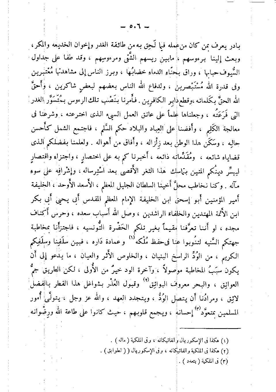 بَادر يعرف بِمن كَانَ من عمله فِيمَا لحق بِهِ من طَائِفَة الْغدر وإخوان الخديعة وَالْمَكْر، وَبعث إِلَيْنَا برؤسهم، مَا بَين ريسهم الشقى ومرءوسهم، وَقد طفا على جداول السيوف حبابها، وراق بحناء الدِّمَاء خضابها، وبرز النَّاس إِلَى مشاهدتها معتبرين وَفِي قدرَة الله مستبصرين، ولدفاع الله النَّاس بَعضهم لبَعض شاكرين، وأحق الله الْحق بكلماته، وَقطع دابر الْكَافرين. فَأمرنَا بِنصب تِلْكَ الرُّءُوس بمنسور الْغدر الَّتِي فرعته، وجعلناها علما على عاتق الْعَمَل السيء الَّذِي اخترعته، وشرعنا فِي معالجة الْكَلم، وأفضنا على الْعباد والبلاد حكم السّلم، فَاجْتمع الشمل كأحسن حَاله، وَسكن هَذَا الوطن بعد زلزاله، وأفاق من أهواله. ولعلمنا بفضلكم الَّذِي قضاياه شائعه، ومقدماته ذائعة، أخبرنَا كم بِهِ على اخْتِصَار، وإجتزاء واقتصار لييسر دينكُمْ المتين بتماسك هَذَا الثغر الْأَقْصَى بعد استرساله، وإشرافه على سوء مآله. وَكُنَّا نخاطب مَحل أخينا السُّلْطَان الْجَلِيل الْمُعظم، الأسعد الأوحد، الْخَلِيفَة أَمِير الْمُؤمنِينَ أَبُو إِسْحَق ابْن الْخَلِيفَة الإِمَام الْمُعظم الْمُقَدّس أبي يحيى أبي بكر ابْن الْأَئِمَّة المهتدين وَالْخُلَفَاء الرَّاشِدين، وصل الله أَسبَاب سعده، وحرس أكناف مجده، لَو أننا تعرفنا مُقيما بِغَيْر تلكم الحضرة التونسيه، فاجتزأنا بمخاطبة جهتكم السنيه لتنوبوا عَنَّا فِي حفظ ملكه وعمادة دَاره، فَبين سلفنا وسلفكم الْكَرِيم، من الود الراسخ الْبُنيان، والخلوص الْأَثر والعيان، مَا يَدْعُو إِلَى أَن يكون سَبَب المخاطبة مَوْصُولا، وآخرة الود خير من الأولى، لَكِن الطَّرِيق جم الْعَوَائِق، وَالْبَحْر مَعْرُوف البوائق وَقبُول الْعذر بشواغل هَذَا الْقطر بِالْفَضْلِ لَائِق، ومرادنا أَن يتَّصل الود، ويتجدد الْعَهْد، وَالله عز وَجل، يتَوَلَّى أُمُور الْمُسلمين بمتعود إحسانه، وَيجمع قُلُوبهم، حَيْثُ كَانُوا على طَاعَة الله ورضوانه