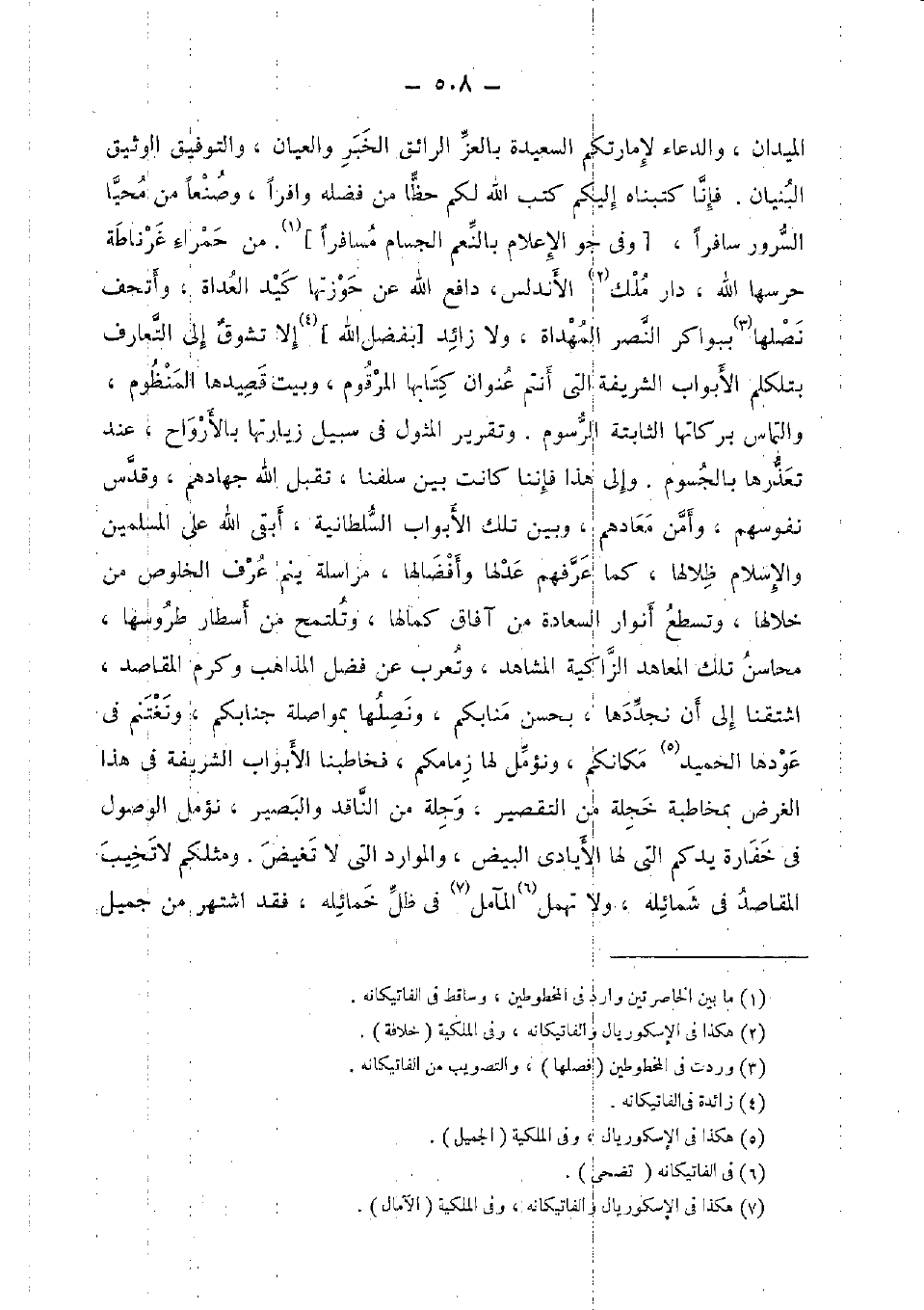 الميدان، وَالدُّعَاء لإمارتكم السعيدة بالعز الرَّائِق الْخَبَر والعيان، والتوفيق الوثيق الْبُنيان. فَإنَّا كتبناه إِلَيْكُم كتب الله لكم حظا من فَضله وافرا، وصنعا من محيا السرُور سافرا، [وَفِي جو الْإِعْلَام بِالنعَم الجسام مُسَافِرًا] . من حَمْرَاء غرناطة حرسها الله، دَار ملك الأندلس، دَافع الله عَن حوزتها كيد العداة، وأتحف نصلها ببواكر النَّصْر المهداة، وَلَا زَائِد [بِفضل الله] إِلَّا تشوق إِلَى التعارف بتلكلم الْأَبْوَاب الشَّرِيفَة الَّتِي أَنْتُم عنوان كتابها المرقوم، وَبَيت قصيدها المنظوم، والتماس بركاتها الثَّابِتَة الرسوم. وَتَقْرِير المثول فِي سَبِيل زيارتها بالأرواح، عِنْد تعذرها بالجسوم. وَإِلَى هَذَا فاننا كَانَت بَين سلفنا، تقبل الله جهادهم، وَقدس نُفُوسهم، وَأمن معادهم، وَبَين تِلْكَ الْأَبْوَاب السُّلْطَانِيَّة، أبقى الله على الْمُسلمين وَالْإِسْلَام ظلالها، كَمَا عرفهم عدلها وأفضالها، مراسلة ينم عرف الخلوص من خلالها، وتسطع أنوار السَّعَادَة من آفَاق كمالها، وتلتمح من أسطار طروسها، محَاسِن تِلْكَ الْمعَاهد الزاكية الْمشَاهد، وتعرب عَن فضل الْمذَاهب وكرم الْمَقَاصِد، اشتقنا إِلَى أَن نجددها، بِحسن منابكم، ونصلها بمواصلة جنابكم، ونغتنم فِي عودهَا الحميد مَكَانكُمْ، ونؤمل لَهَا زمامكم، فخاطبنا الْأَبْوَاب الشَّرِيفَة فِي هَذَا الْغَرَض بمخاطبة خجلة من التَّقْصِير، وَجلة من النَّاقِد والبصير، نؤمل الْوُصُول فِي خفارة يدكم الَّتِي لَهَا الأيادي الْبيض، والموارد الَّتِي لَا تغيض. ومثلكم لَا تخيب الْمَقَاصِد فِي شمائله، وَلَا تهمل المآمل فِي ظلّ خمائله، فقد اشْتهر من جميل