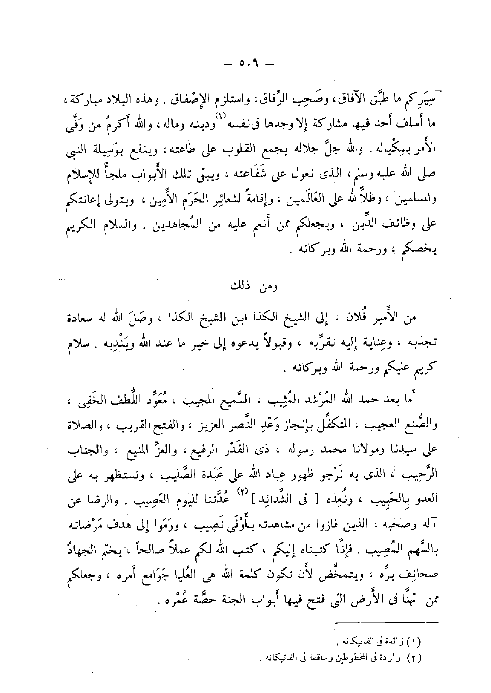 سيركم مَا طبق الْآفَاق، وَصَحب الرفاق، واستلزم الإصفاق. وَهَذِه الْبِلَاد مباركة، مَا أسلف أحد فِيهَا مُشَاركَة إِلَّا وجدهَا فِي نَفسه وَدينه وَمَاله، وَالله أكْرم من وفى الْأَمر بمكياله. وَالله جلّ جَلَاله يجمع الْقُلُوب على طَاعَته، وينفع بوسيلة النَّبِي صلى الله عَلَيْهِ وَسلم، الَّذِي نعول على شَفَاعَته، وَيبقى تِلْكَ الْأَبْوَاب ملْجأ لِلْإِسْلَامِ وَالْمُسْلِمين، وظلا لله على الْعَالمين، وَإِقَامَة لشعائر الْحرم الْأمين، ويتولى إعانتكم على وظائف الدّين، ويجعلكم مِمَّن أنعم عَلَيْهِ من الْمُجَاهدين. وَالسَّلَام الْكَرِيم يخصكم، وَرَحْمَة الله وبكراته.