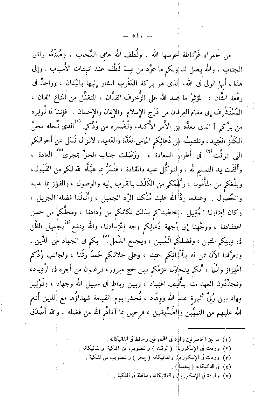 من حَمْرَاء غرناطة حرسها الله، ولطف الله هامي السَّحَاب، وصنعه رائق الجناب، وَالله يصل لنا وَلكم مَا عود من صلَة لطفه عِنْد انبتات الْأَسْبَاب. وَإِلَى هَذَا، أَيهَا الْوَلِيّ فِي الله، الَّذِي هُوَ بركَة الْمغرب الْمشَار إِلَيْهَا بالبنان، وَوَاحِد فِي رفْعَة الشان، الْمُؤثر مَا عِنْد الله على الزخرف الفتان، المتقلل من الْمَتَاع الفان، المستشرف إِلَى مقَام الْعرْفَان من درج الْإِسْلَام وَالْإِيمَان وَالْإِحْسَان. فإننا لما نوثره من بركم [الَّذِي نعده من الْأَمر الأكيد، ونضمره من ودكم] الَّذِي نحله مَحل الْكَنْز العتيد، ونلتمسه من دعائكم التمَاس الْعدة والعديد، لَا نزال نسل عَن أحوالكم الَّتِي ترقت فِي أطوار السَّعَادَة، ووصلت جناب الْحق بمجرى الْعَادة، وَأَلْقَتْ يَد التَّسْلِيم لله، والتوكل عَلَيْهِ بالمقادة، فنسر بِمَا هيأه الله لكم من الْقبُول، وبلغكم من المأمول، وألهمكم من الكلف بِالْقربِ إِلَيْهِ والوصول، والفوز بِمَا لَدَيْهِ والحصول. وعندما رد الله علينا ملكنا الرَّد الْجَمِيل، وأنالنا فَضله الجزيل، وَكَانَ لعثارنا المقيل، خاطبناكم بذلك لمكانكم من ودادنا، ومحلكم من حسن اعتقادنا، ووجهنا إِلَى وجهة دعائكم وَجه اعتدادنا، وَالله ينفع بجميل الظَّن فِي دينكُمْ المتين، وفضلكم الْمُبين، وَيجمع الشمل بكم فِي الْجِهَاد عَن الدّين. وتعرفنا الْآن مِمَّن لَهُ بأنبائكم اعتنا، وعَلى جلالكم حمد وثنا، ولجانب ودكم اعتزاز وَإِنَّمَا، أَنكُمْ يتحاول عزمكم بَين حج مبرور، ترغبون من أجره فِي ازدياد، وتجددون الْعَهْد مِنْهُ بأليف اعتياد، وَبَين رِبَاط فِي سَبِيل الله وَجِهَاد، وتوثير مهاد بَين ربى أثيره عِنْد الله ووهاد، تحْشر يَوْم الْقِيَامَة شهداؤها مَعَ الَّذين أنعم الله عَلَيْهِم من النَّبِيين وَالصديقين، فرحين بِمَا آتَاهُم الله من فَضله، وَالله أصدق