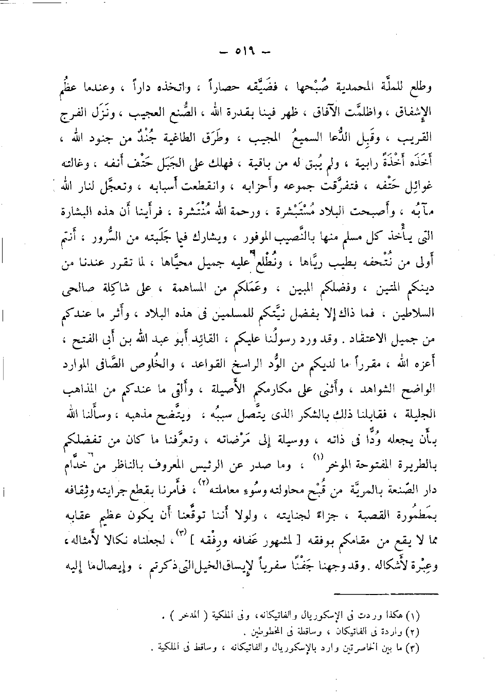 وطلع للملة المحمدية صبحها، فضيقه حصارا، واتخذه دَارا، وعندما عظم الإشفاق، وأظلمت الْآفَاق، ظهر فِينَا بقدرة الله، الصنع العجيب، وَنزل الْفجْر الْقَرِيب، وَقبل الدعا السَّمِيع الْمُجيب، وطرق الطاغية جند من جنود الله، أَخذه أَخْذَة رابية، وَلم يبْق لَهُ من بَاقِيَة، فَهَلَك على الْجَبَل حتف أَنفه، وغالته غوائل حتفه، فتفرقت جموعه وأحزابه، وانقطعت أَسبَابه، وتعجل لنار الله مآبه، وأصبحت الْبِلَاد مستبشرة، وَرَحْمَة الله منتشرة، فَرَأَيْنَا أَن هَذِه الْبشَارَة الَّتِي يَأْخُذ كل مُسلم مِنْهَا بالنصيب الموفور، ويشارك فِيمَا جلبته من السرُور، أَنْتُم أولى من نتحفه بِطيب رياها، ونطلع عَلَيْهِ جميل محياها، لما تقرر عندنَا من دينكُمْ المتين، وفضلكم الْمُبين، وعملكم من المساهمة، على شاكلة صالحي السلاطين، فَمَا ذَاك إِلَّا بِفضل نيتكم الْمُسلمين فِي هَذِه الْبِلَاد، واثر مَا عنْدكُمْ من جميل الِاعْتِقَاد. وَقد ورد رَسُولنَا عَلَيْكُم، الْقَائِد أَبُو عبد الله بن أبي الْفَتْح، أعزه الله، مقررا مَا لديكم من الود الراسخ الْقَوَاعِد، والخلوص الصافي الْمَوَارِد الْوَاضِح الشواهد، وَأثْنى على مكارمكم الأصيلة، وَألقى مَا عنْدكُمْ من الْمذَاهب الجليلة، فقابلنا ذَلِك بالشكر الَّذِي يتَّصل سَببه، ويتضح مذْهبه، وَسَأَلنَا الله بِأَن يَجعله ودا فِي ذَاته، ووسيلة إِلَى مرضاته، وتعرفنا مَا كَانَ من تفضلكم بالطريرة الْمَفْتُوحَة الموخر، وَمَا صدر عَن الرئيس الْمَعْرُوف بالناظر من خدام دَار الصَّنْعَة بالمرية من قبح محاولته وَسُوء مُعَامَلَته، فَأمرنَا بِقطع جرايته وثقافه بمطمورة القصبة، جَزَاء لجنايته، وَلَوْلَا أننا توقعنا أَن يكون عَظِيم عِقَابه مِمَّا لَا يَقع من مقامكم بوفقه [الْمَشْهُور عفافه ورفقه] ، لجعلناه نكالا لأمثاله، وعبرة لأشكاله. وَقد وجهنا جفنا سفريا لإيساق الْخَيل الَّتِي ذكرْتُمْ، وايصال مَا إِلَيْهِ