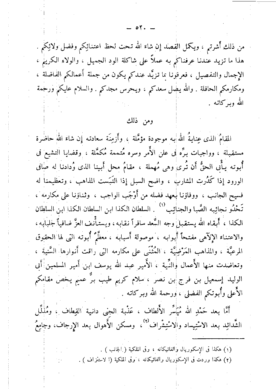 الْمقَام الَّذِي عناية الله بِهِ مَوْجُودَة مؤملة، وأزمنة سعادته إِن شَاءَ الله حَاضِرَة مُسْتَقْبلَة، وواجبات بره فِي علن الْأَمر وسره متممة مكملة، وقضايا التَّشَيُّع فِي أبوته يَأْبَى الْحق أَن ترى وَهِي مُهْملَة، مقَام مَحل أَبينَا الَّذِي ودادنا لَهُ صافي الْوُرُود إِذا كدرت المشارب، وَاضح السبل إِذا التبست الْمذَاهب، وتعظيمنا لَهُ فسيح الْجَانِب، ووفائنا بِعَهْد فَضله من أوجب الْوَاجِب، وثناؤنا على مكارمه، تحدو نجائبه الصِّبَا والجنائب. السُّلْطَان الكذا ابْن السُّلْطَان الكذا ابْن السُّلْطَان الكذا، أبقاه الله يسْتَقْبل وَجه السعد سافرا نقابه، ويستأنف الْعِزّ ضافيا جلبابه، والاعتناء الإلآهي مفتحا أبوابه، مَوْصُولَة أَسبَابه، مُعظم أبوته الَّتِي لَهَا الْحُقُوق المرعية، والمذاهب المرضية، الْمثنى على مكارمه الَّتِي راقت أنوارها السّنيَّة، وتعاضدت مِنْهَا الْأَعْمَال وَالنِّيَّة، الْأَمِير عبد الله يُوسُف ابْن أَمِير الْمُسلمين أبي الْوَلِيد إِسْمَعِيل بن فرج بن نصر، سَلام كريم طيب بر عميم يخص مقامكم الْأَعْلَى وأبوتكم الفضلى، وَرَحْمَة الله وَبَرَكَاته.