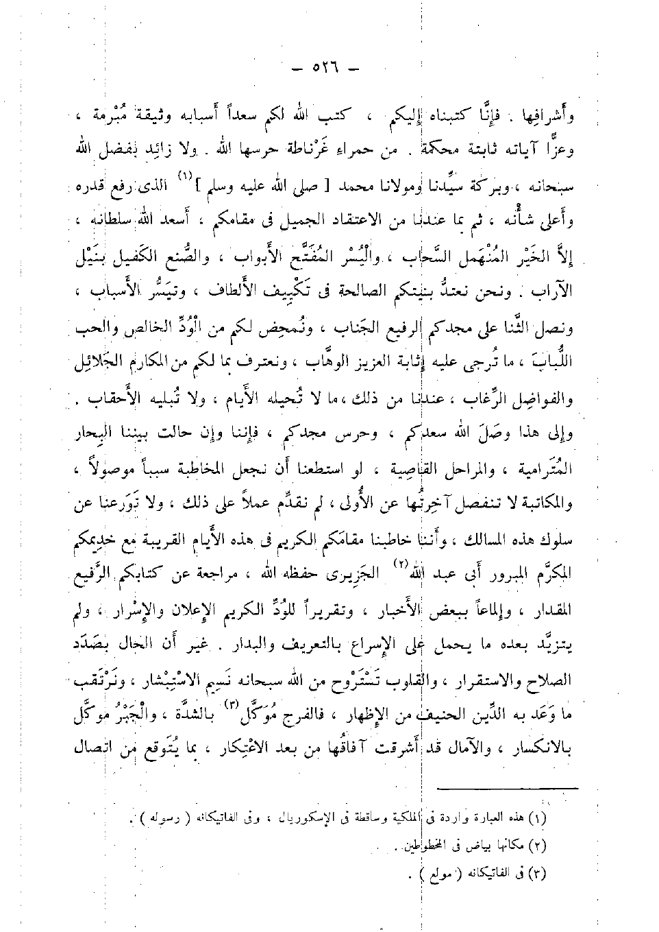 وأشرافها، فَإنَّا كتبناه إِلَيْكُم، كتب الله لكم سَعْدا أَسبَابه وَثِيقَة مبرمة، وَعزا آيَاته ثَابِتَة محكمَة. من حَمْرَاء غرناطة حرسها الله. وَلَا زَائِد بِفضل الله سُبْحَانَهُ، وبركة سيدنَا ومولانا مُحَمَّد] صلى الله عَلَيْهِ وَسلم] الَّذِي رفع قدره وَأَعْلَى شَأْنه، ثمَّ بِمَا عندنَا من الِاعْتِقَاد الْجَمِيل فِي مقامكم، أسعد الله سُلْطَانه، إِلَّا الْخَيْر المنهمل السَّحَاب، واليسر المفتح الْأَبْوَاب، والصنع الْكَفِيل بنيل الْآرَاب. وَنحن نعتد بنيتكم الصَّالِحَة فِي تكييف الألطاف، وتيسر الْأَسْبَاب، ونصل الثنا على مجدكم الرفيع الجناب، ونمحض لكم من الود الْخَالِص وَالْحب اللّبَاب، مَا ترجى عَلَيْهِ إثابة الْعَزِيز الْوَهَّاب، ونعترف بِمَا لكم من المكارم والجلائل والفواضل الرغاب، عندنَا من ذَلِك، مَا لَا تحيله الْأَيَّام، وَلَا تبليه الأحقاب. وَإِلَى هَذَا وصل الله سعدكم، وحرس مجدكم، فإننا وَإِن حَالَتْ بَيْننَا الْبحار المترامية، والمراحل القاصية، لَو استطعنا أَن نجْعَل المخاطبة سَببا مَوْصُولا، وَالْمُكَاتبَة لَا تنفصل آخرتها عَن الأولى، لم نقدم عملا على ذَلِك، وَلَا تورعنا عَن سلوك هَذِه المسالك، وأننا خاطبنا مقامكم الْكَرِيم فِي هَذِه الْأَيَّام الْقَرِيبَة مَعَ خديمكم المكرم المبرور أبي عبد الله الجزيري حفظه الله، مُرَاجعَة عَن كتابكُمْ الرفيع الْمِقْدَار، وإلماعا بِبَعْض الْأَخْبَار، وتقريرا للود الْكَرِيم الإعلان والإسرار، وَلم يتزيد بعده مَا يحمل على الْإِسْرَاع بالتعريف والبدار. غير أَن الْحَال بصدد الصّلاح والاستقرار، والقلوب تستروح من الله سُبْحَانَهُ نسيم الاستبشار، ونرتقب مَا وعد بِهِ الدّين الحنيف من الْإِظْهَار، فالفرج مُوكل بالشدة، والجبر مُوكل بالانكسار، والآمال قد أشرقت آفاقها من بعد الاعتكار، بِمَا يتَوَقَّع من اتِّصَال