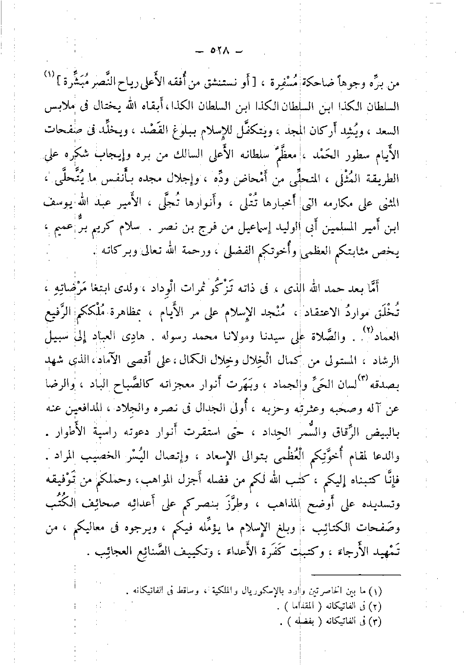 أما بعد حمد الله الَّذِي، فِي ذَاته تزكو ثَمَرَات الوداد، ولدى ابتغا مرضاته، تخلق موارد الِاعْتِقَاد، منجد الْإِسْلَام على مر الْأَيَّام، بمظاهرة ملككم الرفيع الْعِمَاد. وَالصَّلَاة على سيدنَا ومولانا مُحَمَّد رَسُوله. هادي الْعباد إِلَى سَبِيل الرشاد، المستولي من كَمَال الْخلال وخلال الْكَمَال، على أقْصَى الآماد، الَّذِي شهد بِصَدقَة لِسَان الْحَيّ والجماد، وبهرت أنوار معجزاته كالصباح الباد، وَالرِّضَا عَن آله وَصَحبه وعثرته وَحزبه، أولى الْجِدَال فِي نَصره والجلاد، المدافعين عَنهُ بالبيض الرقَاق والسمر الْحداد، حَتَّى اسْتَقَرَّتْ أنوار دَعوته راسية الأطوار. والدعا لمقام أخوتكم الْعُظْمَى بتوالي الإسعاد، واتصال الْيُسْر الخصيب المُرَاد. فَإنَّا كتبناه إِلَيْكُم، كتب الله لكم من فَضله أجزل الْمَوَاهِب، وحملكم من توفيقه وتسديده على أوضح الْمذَاهب، وطرز بنصركم على أعدائه صَحَائِف الْكتب وصفحات الْكَتَائِب، وَبلغ الْإِسْلَام مَا يؤمله فِيكُم، ويرجوه فِي معاليكم، من تمهيد الأرجاء، وَكتب كفرة الْأَعْدَاء، وتكييف الصَّنَائِع الْعَجَائِب.