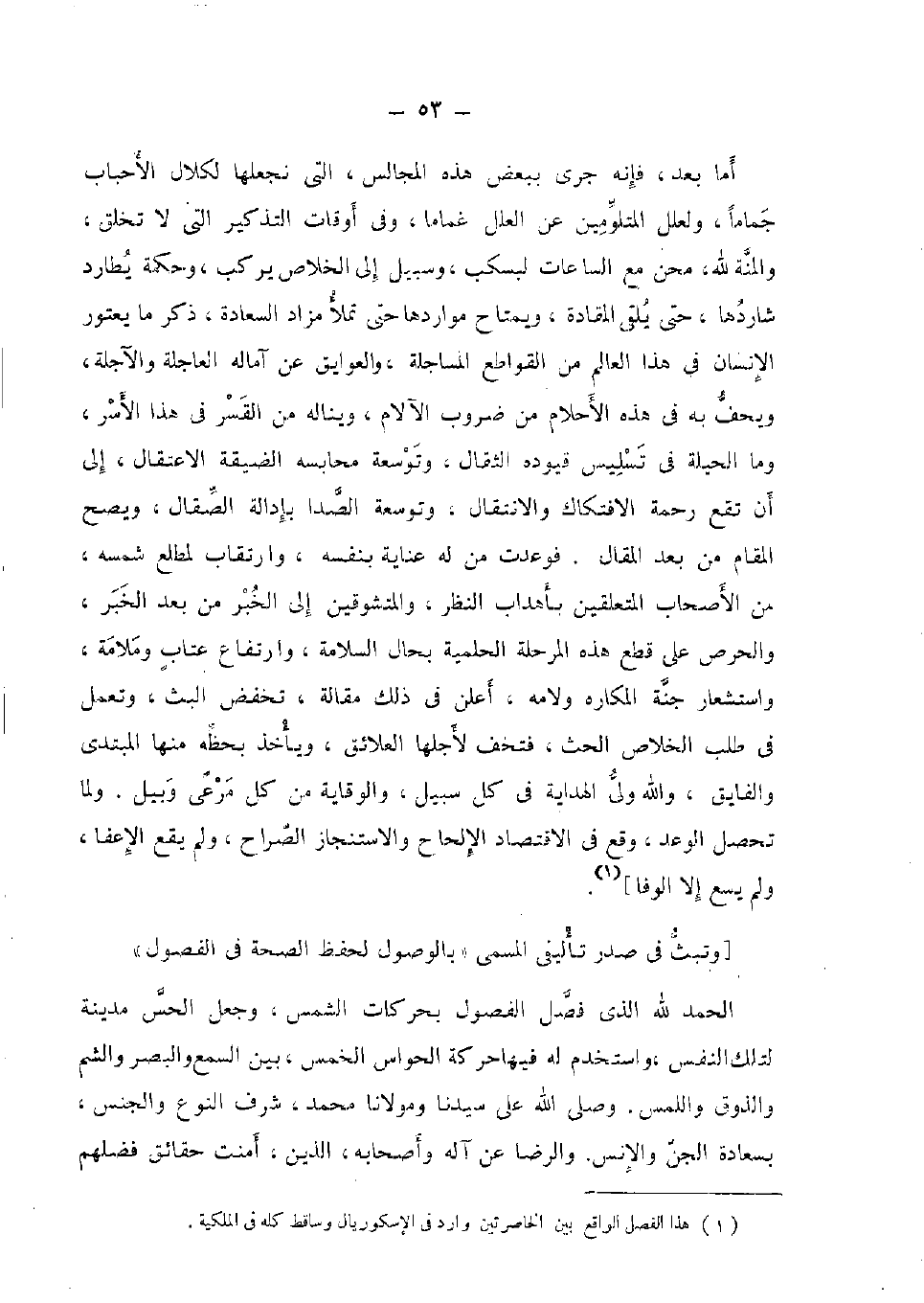 الْحَمد لله الَّذِي فصل الْفُصُول بحركات الشَّمْس، وَجعل الْحس مَدِينَة لتِلْك النَّفس، واستخدم لَهُ فِيهَا حَرَكَة الْحَواس الْخمس، بَين السّمع وَالْبَصَر والشم والذوق واللمس. وَصلى الله على سيدنَا ومولانا مُحَمَّد، شرف النَّوْع وَالْجِنْس، بسعادة الْجِنّ وَالْإِنْس. وَالرِّضَا عَن آله وَأَصْحَابه، الَّذين، أمنت حقائق فَضلهمْ