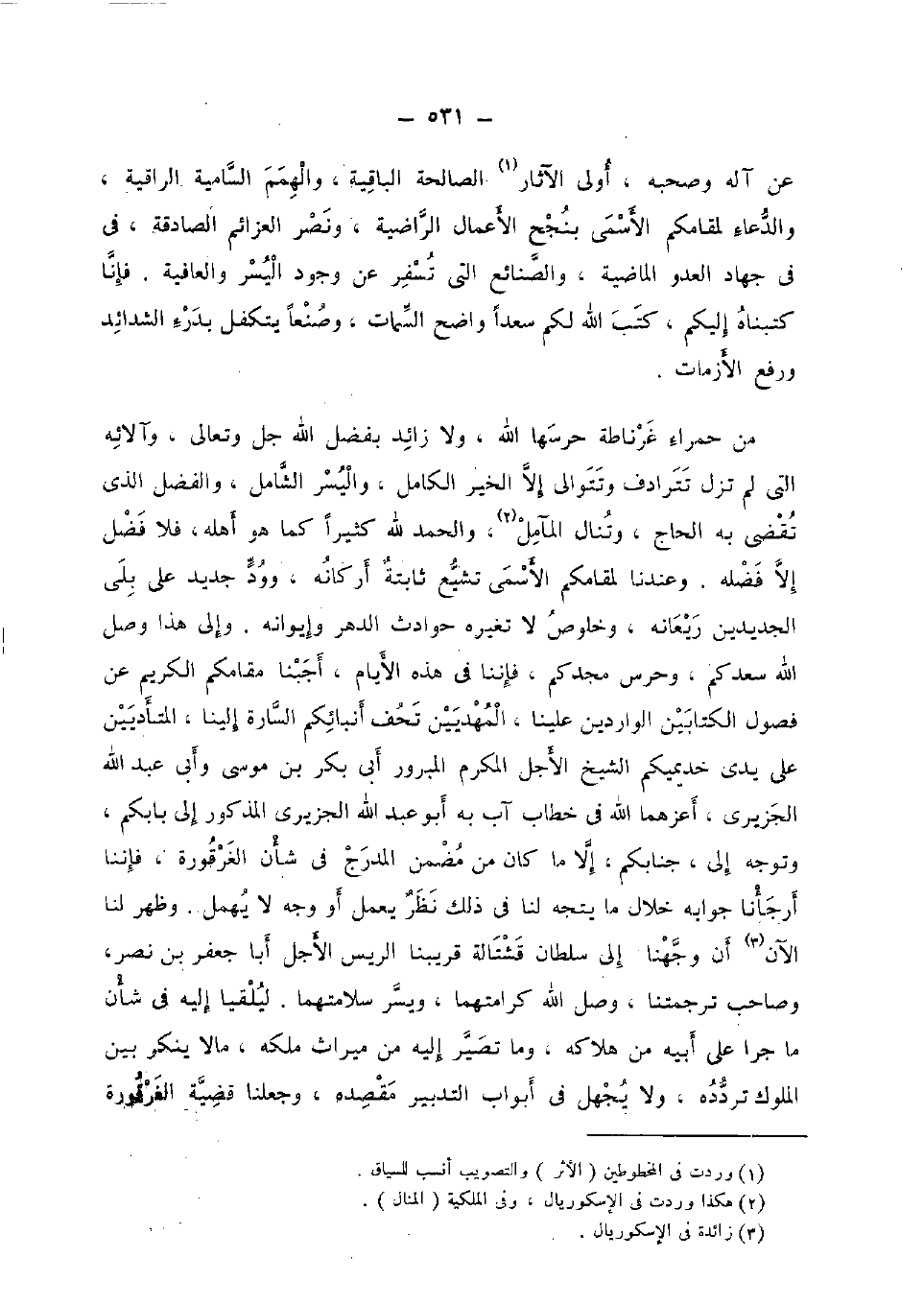 عَن آله وَصَحبه، أولي الْآثَار الصَّالِحَة الْبَاقِيَة، والهمم السامية الراقية، وَالدُّعَاء لمقامكم الأسمى بنجح الْأَعْمَال الراضية، وَنصر العزائم الصادقة، فِي فِي جِهَاد الْعَدو الْمَاضِيَة، والصنائع الَّتِي تسفر عَن وجود الْيُسْر والعافية. فَإنَّا كتبناه إِلَيْكُم، كتب الله لكم سَعْدا وَاضح السمات، وصنعا يتكفل بدرء الشدائد وَرفع الأزمات.
