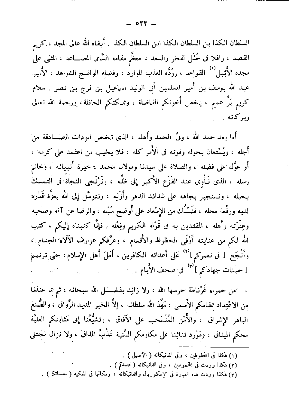 أما بعد حمد الله، ولي الْحَمد وَأَهله، الَّذِي تخلص المودات الصادقة من أَجله، ويستعان بحوله وقوته فِي الْأَمر كُله، فَلَا يخيب من اعْتمد على كرمه، أَو عول على فَضله، وَالصَّلَاة على سيدنَا ومولانا مُحَمَّد، خيرة أنبيائه، وَخَاتم رسله، الَّذِي نأوي عِنْد الْفَزع الْأَكْبَر إِلَى ظله، ونرتجي النجَاة فِي التَّمَسُّك بحبله، ونستجير بجاهه على شَدَائِد الدَّهْر وأزله، ونتوسل إِلَى الله بعزة قدره لَدَيْهِ ورفعة مَحَله، فسلك من الإسعاد على أوضح سبله، وَالرِّضَا عَن آله وَصَحبه وعترته وَأَهله، المقتدين بِهِ فِي قَوْله الْكَرِيم وَفعله. فَإنَّا كتبناه إِلَيْكُم، كتب الله لكم من عنايته أوفى الحظوظ والأقسام، وعرفكم عوارف الآلاء الجسام، وأنجح [فِي نصركم] على أعدائه الْكَافرين، أمل أهل الْإِسْلَام، حَتَّى ترتسم [حَسَنَات جهادكم] فِي صحف الْأَيَّام.