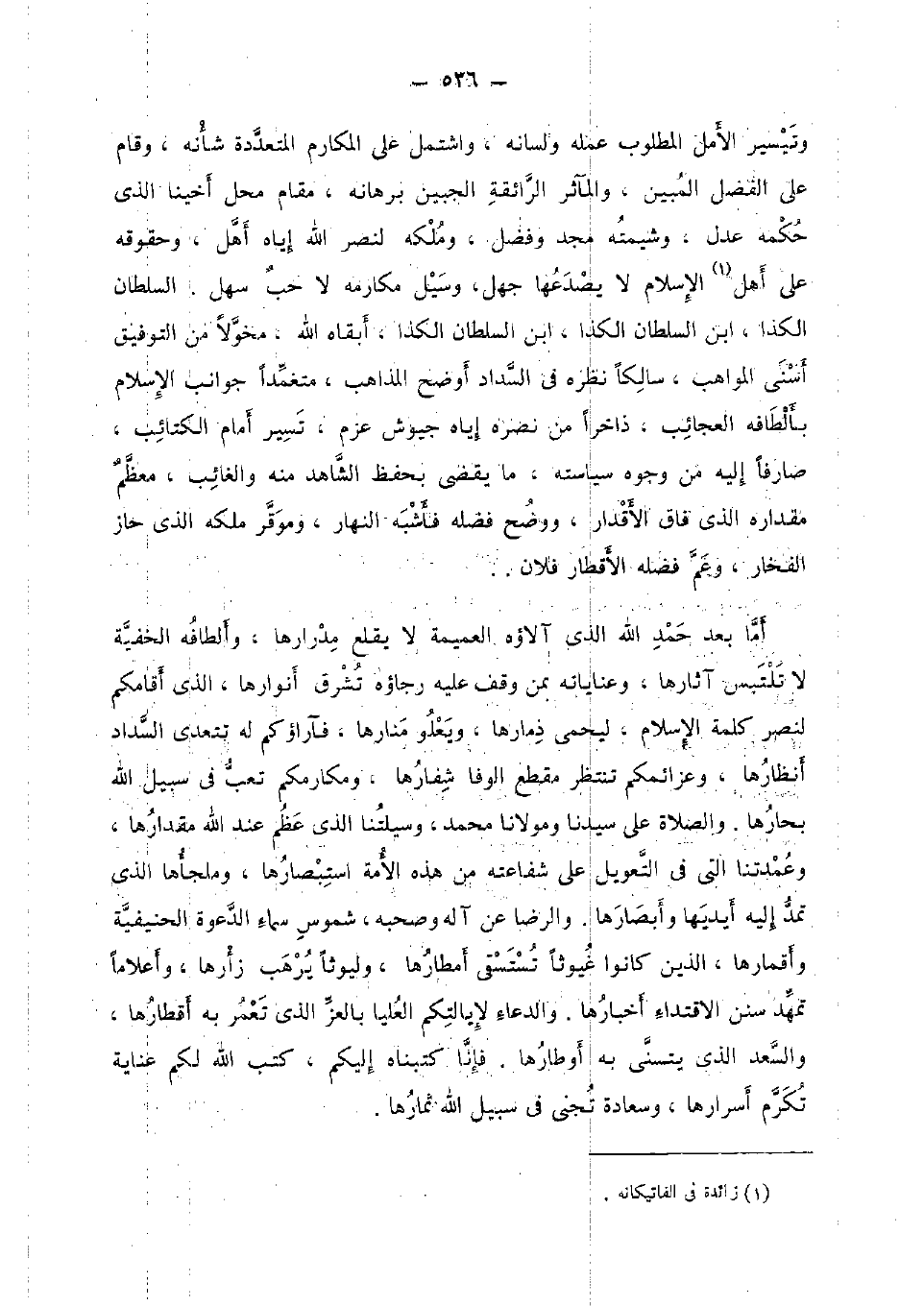 أما بعد حمد الله الَّذِي آلاؤه العميمة لَا يقْلع مدرارها، وألطافه الْخفية لَا تَلْتَبِس آثارها، وعناياته بِمن وقف عَلَيْهِ رجاؤه تشرق أنوارها، الَّذِي أقامكم لنصر كلمة الْإِسْلَام، ليحمي ذمارها، ويعلو منارها، فآراؤكم لَهُ تتعدى السداد أنظارها، وعزائمكم تنْتَظر مقطع الوفا شفارها، ومكارمكم تَعب فِي سَبِيل الله بحارها. وَالصَّلَاة على سيدنَا ومولانا مُحَمَّد، وسيلتنا الَّذِي عظم عِنْد الله مقدارها، وعمدتنا الَّتِي فِي التعويل على شَفَاعَته من هَذِه الْأمة استبصارها، وملجأها الَّذِي تمد إِلَيْهِ أيديها وأبصارها. وَالرِّضَا عَن آله وَصَحبه، شموس سَمَاء الدعْوَة الحنيفية وأقمارها، الَّذين كَانُوا غيوثا تستسقى أمطارها، وليوثا يرهب زأرها، وأعلاما تمهد سنَن الِاقْتِدَاء أَخْبَارهَا. وَالدُّعَاء لإيالتكم الْعليا بالعز الَّذِي تعمر بِهِ أقطارها، والسعد الَّذِي يتسنى بِهِ أوطارها. فَإنَّا كتبناه إِلَيْكُم، كتب الله لكم عناية تكرم أسرارها، وسعادة تجنى فِي سَبِيل الله ثمارها.