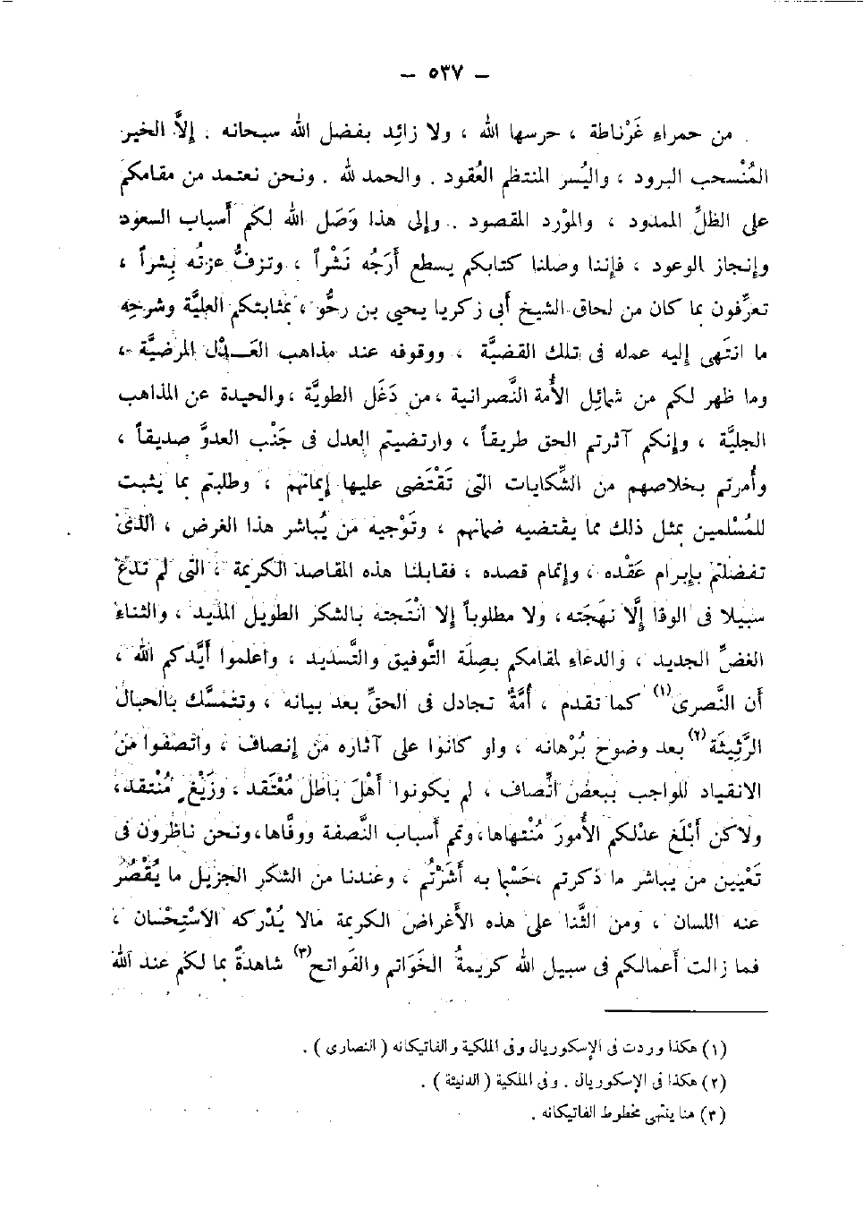 من حَمْرَاء غرناطة، حرسها الله، وَلَا زَائِد بِفضل الله سُبْحَانَهُ. إِلَّا الْخَيْر المنسحب البرود، واليسر المنتظم الْعُقُود. وَالْحَمْد لله. وَنحن نعتمد من مقامكم على الظل الْمَمْدُود، والمورد الْمَقْصُود. وَإِلَى هَذَا وصل الله لكم أَسبَاب السُّعُود وإنجاز الوعود، فإننا وصلنا كتابكُمْ يسطع أرجه نشرا، وتزف عزته بشرا، تعرفُون بِمَا كَانَ من لحاق الشَّيْخ أبي زَكَرِيَّا يحي بن رحو، بمثابتكم الْعلية وَشَرحه مَا انْتهى إِلَيْهِ عمله فِي تِلْكَ الْقَضِيَّة، ووقوفه عِنْد مَذَاهِب الْعدْل المرضية، وَمَا ظهر لكم من شمائل الْأمة النَّصْرَانِيَّة، من دغل الطوية، والحيدة عَن الْمذَاهب الجلية، وَإِنَّكُمْ آثرتم الْحق طَرِيقا، وارتضيتم الْعدْل فِي جنب الْعَدو صديقا، وأمرتم بخلاصهم من الشكايات الَّتِي تَقْتَضِي عَلَيْهِم إِيمَانهم، وطلبتم بِمَا يثبت للْمُسلمين بِمثل ذَلِك مِمَّا يَقْتَضِيهِ ضمانهم، وتوجيه من يُبَاشر هَذَا الْغَرَض، الَّذِي تفضلتم بإبرام عقده، وإتمام قَصده، فقابلنا هَذِه الْمَقَاصِد الْكَرِيمَة، الَّتِي لم تدع سَبِيلا فِي الوفا إِلَّا نهجته، وَلَا مَطْلُوبا إِلَّا أنتجته بالشكر الطَّوِيل المديد، وَالثنَاء الغض الْجَدِيد، وَالدُّعَاء لمقامكم بصلَة التَّوْفِيق والتسديد، وَاعْلَمُوا أيدكم الله، أَن النصرى كَمَا تقدم، أمه تجَادل فِي الْحق بعد بَيَانه، وتتمسك بالحبال الرثيثة بعد وضوح برهانه، وَلَو كَانُوا على آثاره من إنصاف، واتصفوا من الانقياد للْوَاجِب بِبَعْض اتصاف، لم يَكُونُوا أهل بَاطِل مُعْتَقد، وزيغ منتقد، ولاكن أبلغ عدلكم الْأُمُور مُنْتَهَاهَا، وتمم أَسبَاب النصفة ووفاها، وَنحن ناظرون فِي تعْيين من يُبَاشر مَا ذكرْتُمْ حَسْبَمَا بِهِ أشرتم، وَعِنْدنَا من الشُّكْر الجزيل مَا يقصر عَنهُ اللِّسَان، وَمن الثنا على هَذِه الْأَغْرَاض الْكَرِيمَة مَا لَا يُدْرِكهُ الِاسْتِحْسَان، فَمَا زَالَت أَعمالكُم فِي سَبِيل الله كَرِيمَة الْخَوَاتِم والفواتح شاهدة بِمَا لكم عِنْد الله