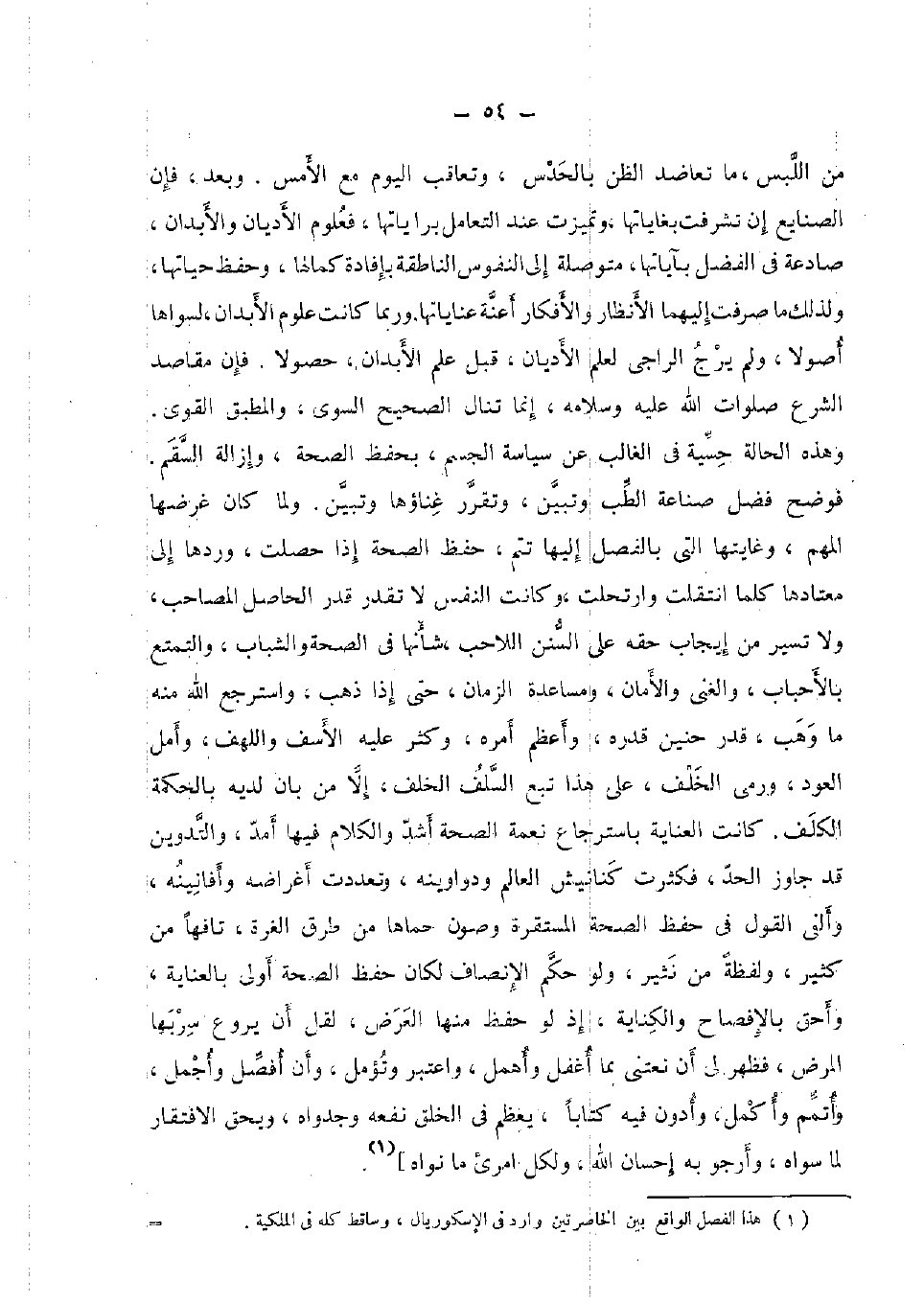 من اللّبْس، مَا تعاضد الظَّن بالحدس، وتعاقب الْيَوْم مَعَ الأمس. وَبعد، فَإِن الصنايع إِن تشرفت بغاياتها، وتميزت عِنْد التَّعَامُل براياتها، فعلوم الْأَدْيَان والأبدان، صادعة فِي الْفضل بآياتها، متوصلة إِلَى النُّفُوس الناطقة بإفادة كمالها، وَحفظ حَيَاتهَا، وَلذَلِك مَا صرفت إِلَيْهِمَا الأنظار والأفكار أَعِنَّة عناياتها. وَرُبمَا كَانَت عُلُوم الْأَبدَان، لسواها أصولا، وَلم يرج الراجي لعلم الْأَدْيَان، قبل علم الْأَبدَان، حصولا. فَإِن مَقَاصِد الشَّرْع صلوَات الله عَلَيْهِ وَسَلَامه، إِنَّمَا تنَال الصَّحِيح السوي، والمطبق الْقوي. وَهَذِه الْحَالة حسية فِي الْغَالِب عَن سياسة الْجِسْم، بِحِفْظ الصِّحَّة، وَإِزَالَة السقم. فوضح فضل صناعَة الطِّبّ وَتبين، وتقرر غنَاؤُهَا وَتبين. وَلما كَانَ غرضها المهم، وغايتها الَّتِي بِالْفَصْلِ إِلَيْهَا تتمّ، حفظ الصِّحَّة إِذا حصلت، وردهَا إِلَى معتادها كلما انْتَقَلت وَارْتَحَلت، وَكَانَت النَّفس لَا تقدر قدر الْحَاصِل المصاحب، وَلَا تسير من إِيجَاب حَقه على السّنَن اللاحب شَأْنهَا فِي الصِّحَّة والشباب، والتمتع بالأحباب، والغنى والأمان، ومساعدة الزَّمَان حَتَّى إِذا ذهب، واسترجع الله مِنْهُ مَا وهب، قدر حنين قدره، وَأعظم أمره، وَكثر عَلَيْهِ الأسف واللهف، وأمل الْعود، وَرمى الْخلف، على هَذَا تبع السّلف الْخلف، إِلَّا من بَان لَدَيْهِ بالحكمة الكلف. كَانَت الْعِنَايَة باسترجاع نعْمَة الصِّحَّة أَشد وَالْكَلَام فِيهَا أمد، والتدوين قد جَاوز الْحَد، فكثرت كنانيش الْعَالم ودواوينه، وتعددت أغراضه وأفانينه، وألفى القَوْل فِي حفظ الصِّحَّة المستقرة وصون حماها من طرق الْغرَّة، تافها من كثير، وَلَفْظَة من نثير، وَلَو حكم الأنصاف لَكَانَ حفظ الصِّحَّة أولى بالعناية، وأحق بالإفصاح وَالْكِنَايَة، إِذْ لَو حفظ مِنْهَا الْعرض، لقل أَن يروع سربها الْمَرَض، فَظهر لي أَن نعتني بِمَا أغفل وأهمل، وَاعْتبر وتؤمل، وَأَن أفصل وأجمل، وأتمم وأكمل، وأدون فِيهِ كتابا، يعظم فِي الْخلق نَفعه وجدواه، ويحق الافتقار لما سواهُ، وَأَرْجُو بِهِ إِحْسَان الله، وَلكُل امرىء مَا نَوَاه] .