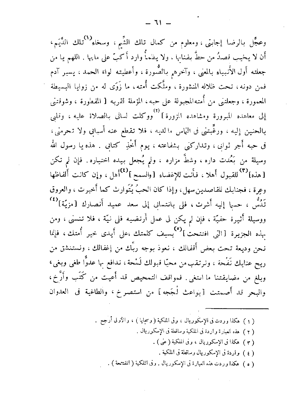 وَعجل بِالرِّضَا إجَابَتِي، وَمَعْلُوم من كَمَال تِلْكَ الشيم، وسخاء تِلْكَ الديم، أَن لَا يخيب قصد من حط بفنايها، وَلَا يظمأ وَارِد أكب على مَا يها. اللَّهُمَّ يَا من جعلته أول الْأَنْبِيَاء بِالْمَعْنَى، وَآخرهمْ بالصورة، وأعطيته لِوَاء الْحَمد، يسير آدم فَمن دونه، تَحت ظلاله المنشورة وملكت أمته، مَا زوى لَهُ من زَوَايَا البسيطة المعمورة، وجعلتني من أمته المجبولة على حبه، المؤملة لقُرْبه [المفطورة، وشوقتني إِلَى معاهده المبرورة ومشاهده المزورة] ووكلت لساني بِالصَّلَاةِ عَلَيْهِ، وقلبي بالحنين إِلَيْهِ، ورغبتني فِي التمَاس مَا لَدَيْهِ، فَلَا تقطع عَنهُ أسبابي وَلَا تحرمني فِي حبه أجر ثوابي، وتداركني بِشَفَاعَتِهِ، يَوْم أَخذ كتابي. هَذِه يَا رَسُول الله وَسِيلَة من بَعدت دَاره، وشط مزاره، وَلم يَجْعَل بِيَدِهِ اخْتِيَاره. فَإِن لم تكن [هَذِه] للقبول أَهلا، فَأَنت للإغضاءٌ [والسمح] أهل، وَإِن كَانَت ألفاظها وعرة، فجنابك للقاصدين سهل، وَإِذا كَانَ الْحبّ يتوارث كَمَا أخْبرت، وَالْعُرُوق تدس، حَسْبَمَا إِلَيْهِ أَشرت، فلى بانتسابي إِلَى سعد عميد أنصارك [مزية] ووسيلة أثيرة خُفْيَة، فَإِن لم يكن لي عمل أرتضيه فلي نِيَّة، فَلَا تنسني، وَمن بِهَذِهِ الجزيرة [الَّتِي افتتحت] بِسيف كلمتك، على أَيدي خير أمتك، فَإِنَّمَا نَحن وَدِيعَة تَحت بعض أقفالك، نَعُوذ بِوَجْه رَبك من إغفالك، ونستنشق من ريح عنايك نفحة، ونرتقب من محيا قبولك لمحة، ندافع بهَا عدوا طَغى وبغى، وَبلغ من مضايقتنا مَا ابْتغى. فمواقف التمحيص قد أعيت من كتب وأرخ، وَالْبَحْر قد أصمتت [بواعث لججه] من استصرخ، والطاغية فِي الْعدوان